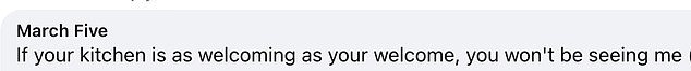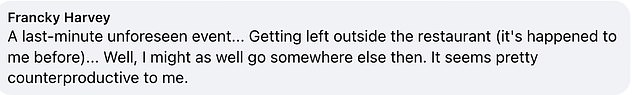 A second furiously wrote: ‘A last-minute unforeseen event… Getting left outside the restaurant (it’s happened to me before)… Well, I might as well go somewhere else then. It seems pretty counterproductive to me.’