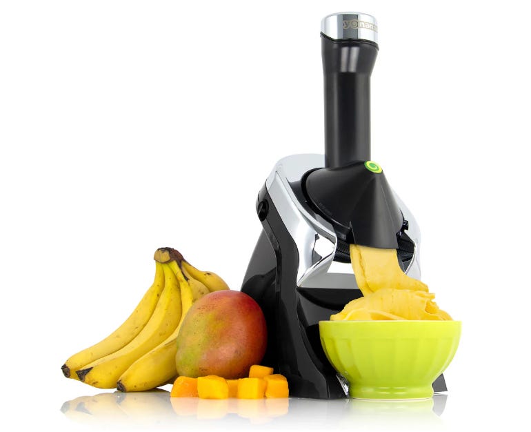 The Yonanas is one of a number of appliances dedicated to making soft-serve-style sorbet or nice cream from frozen fruit. You push chunks of frozen fruit down a chute using a plunger, where it’s forced past a spinning blade. In addition to the Deluxe model pictured above, Yonanas also offers the 902 Classic model at $39.