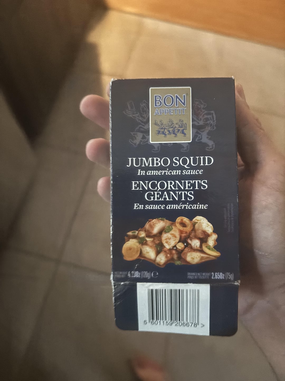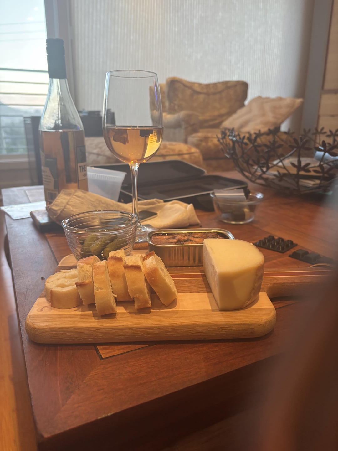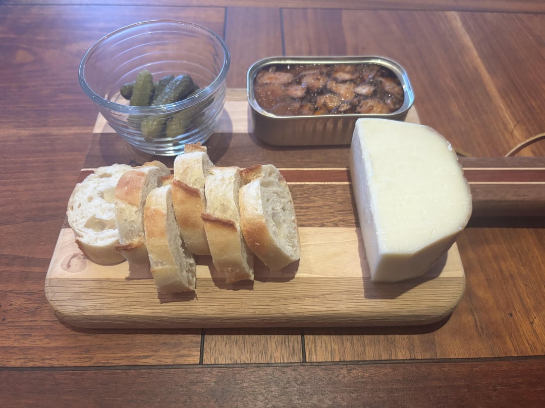 Tinned squid in American Sauce, Baguette, Basque cheese, and cornichon