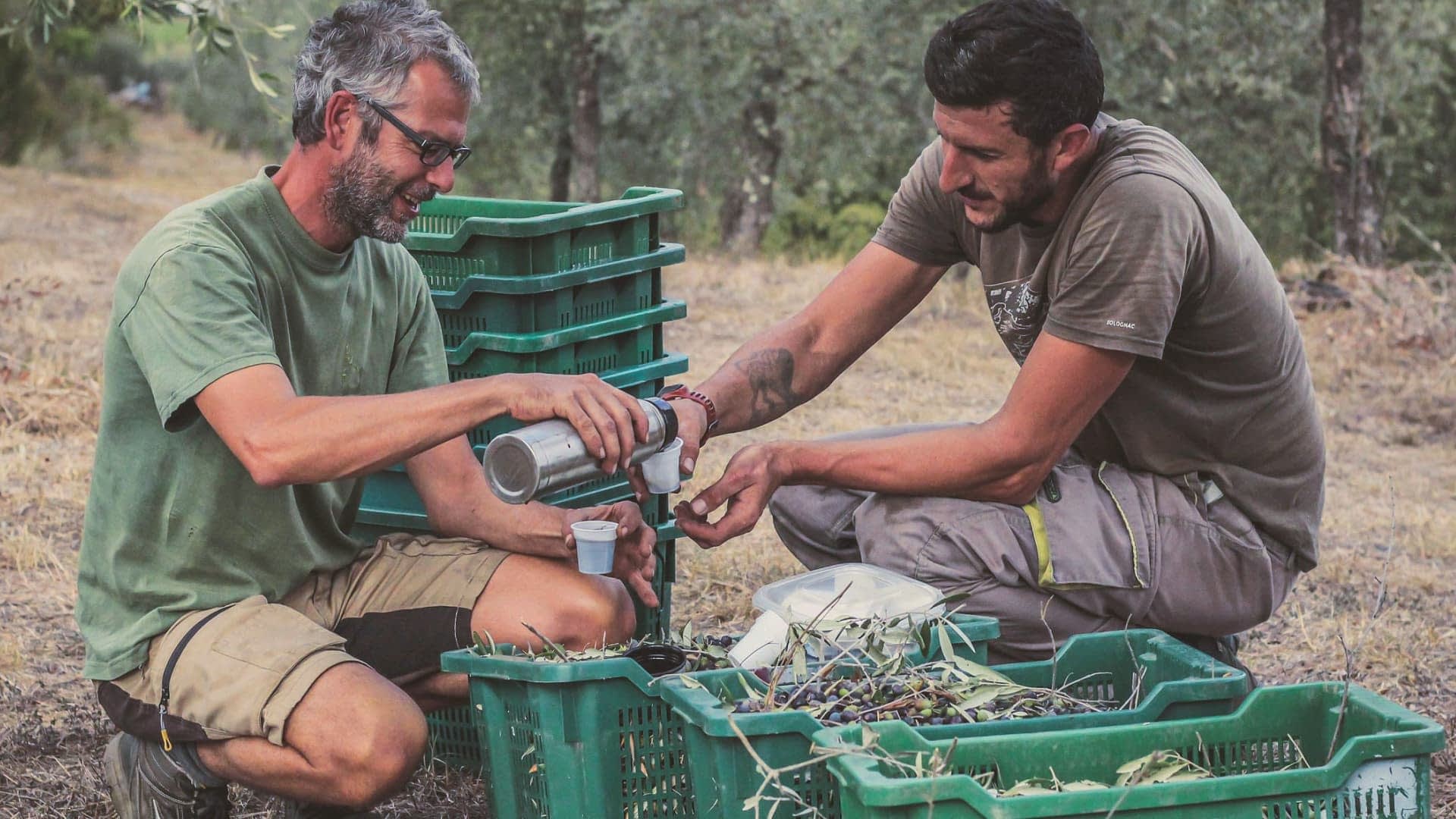 A coffee break during the harvest at Balatro grove. (Photo: Fil Bucchino)