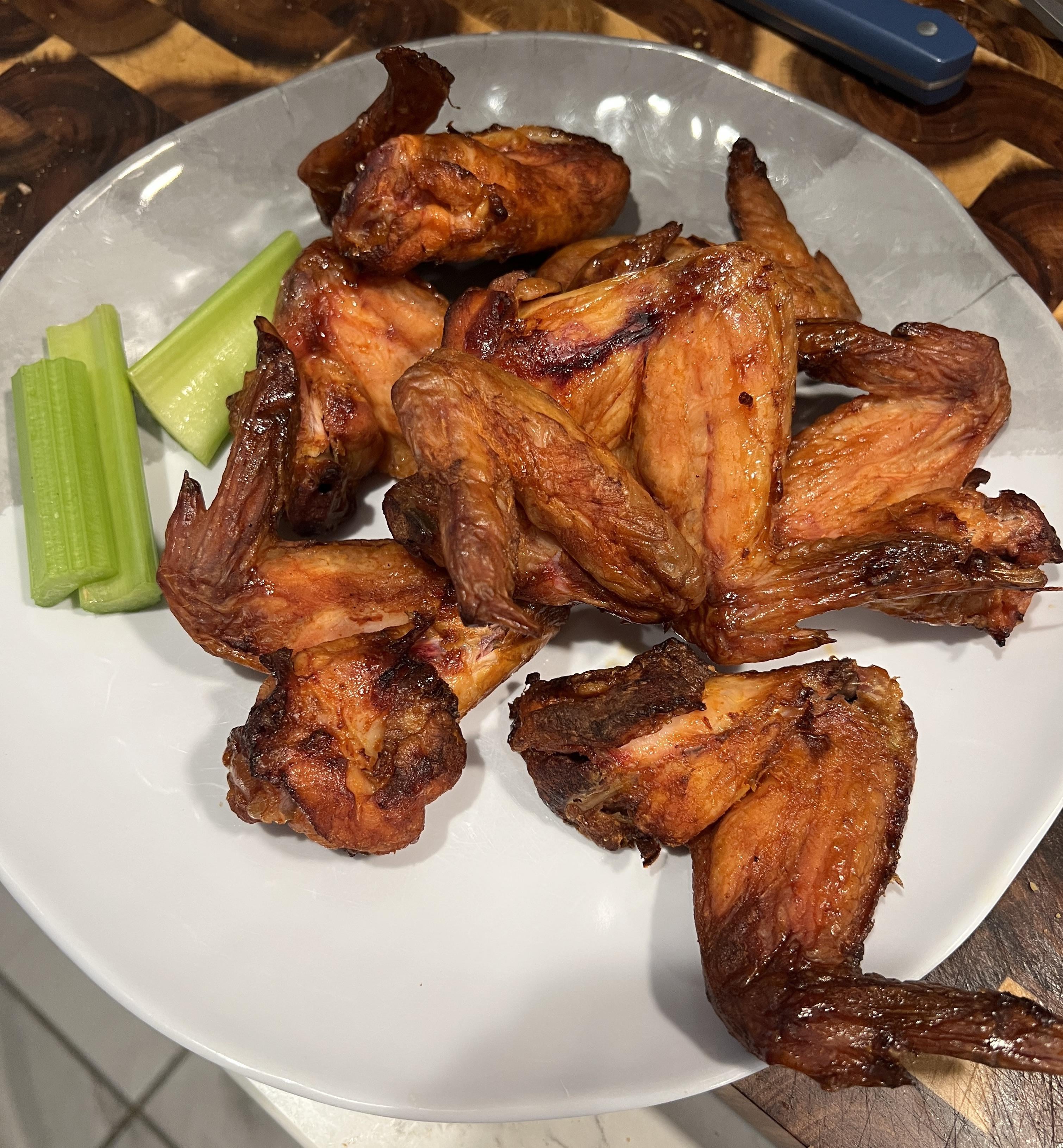 Marinate wings for 24-48 hours in franks hot sauce. Smoke wings at 250°F for 3 hours, flipping once. Served with celery, home made blue cheese, and I had my home made hot roasted garlic parm sauce for dipping, but they don’t really need tossing.