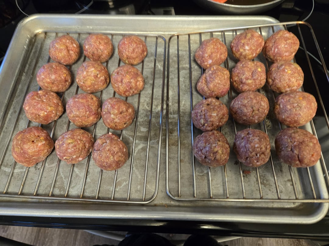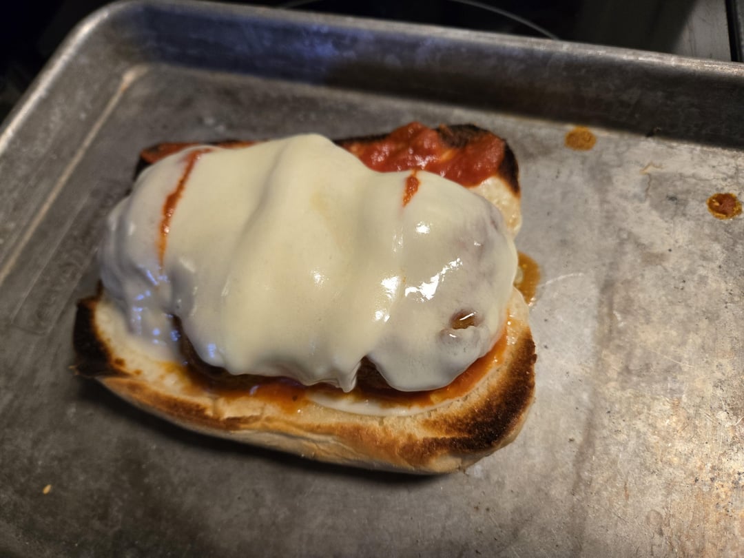 Half ground beef/mild Italian sausage meatballs smoked, then simmered in a four cheese marinara sauce. Toasted hoagie roll with butter, layered with a provolone base, sliced meatballs, sauce and topped with some mozzarella and toasted until melty.