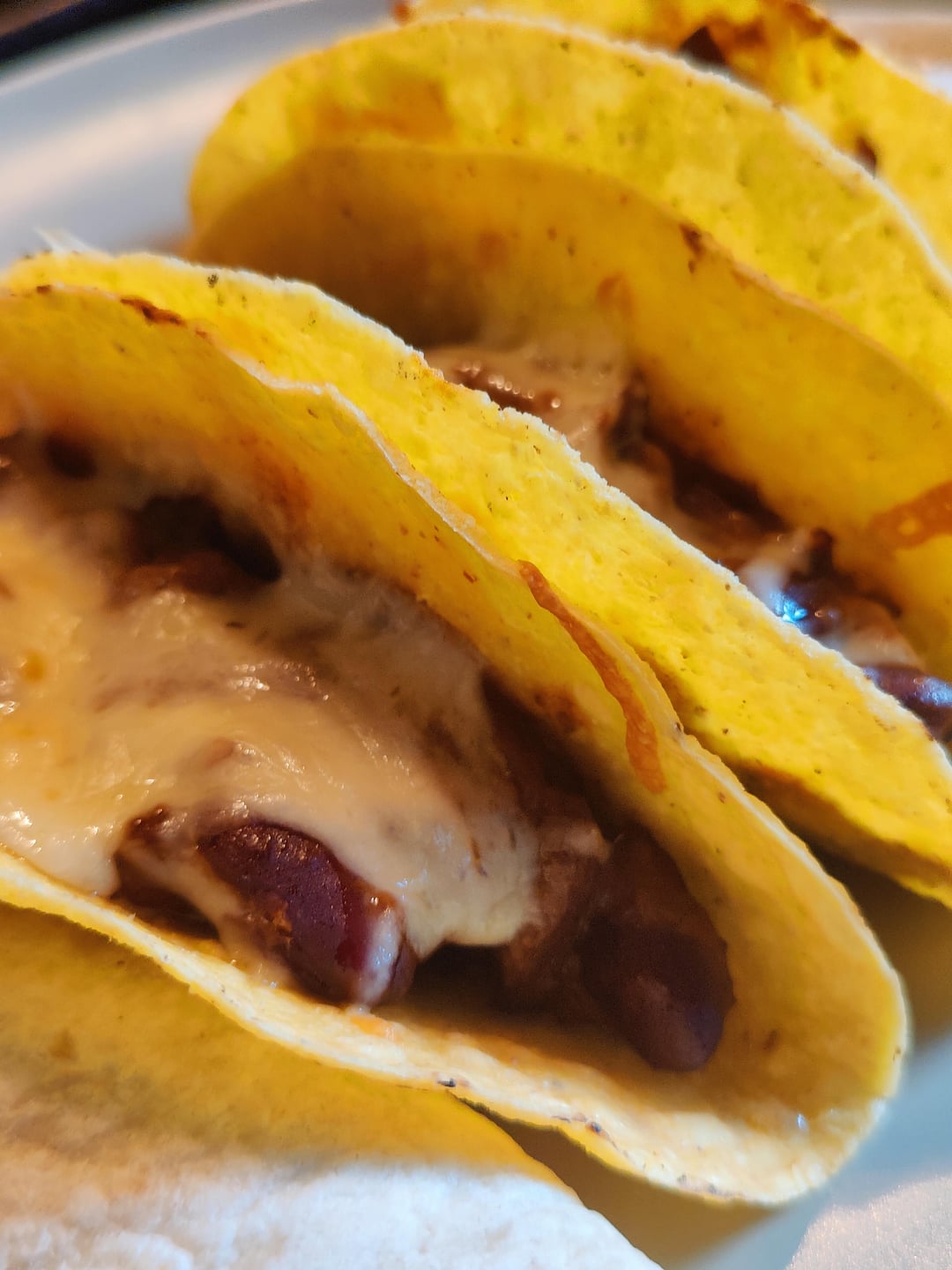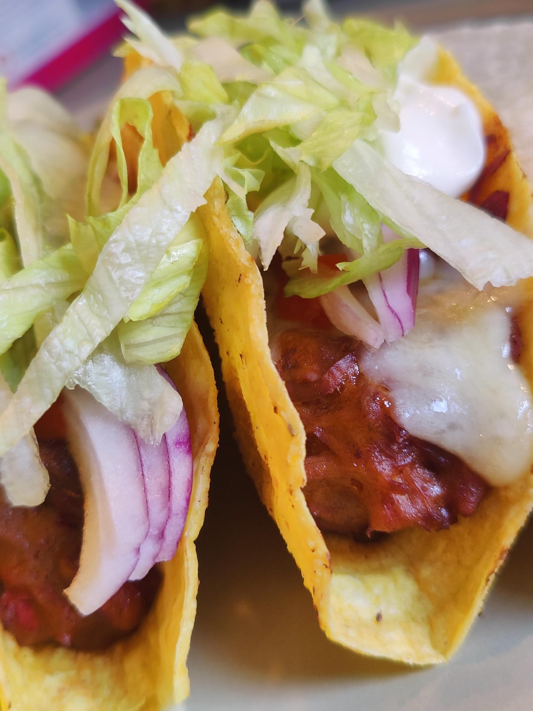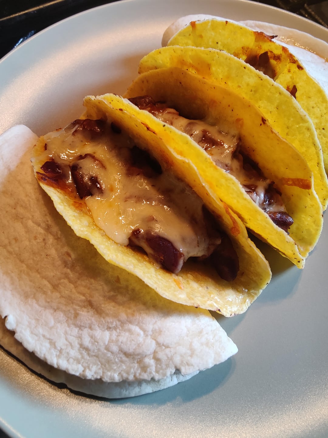 I didn't follow an actual birria recipe, just kind of went based on vibes. It's a beef skirt, onion, chilli, and kidney bean stew seasoned with paprika and cumin, with tomato puree and chipotle pate, cooked on a low heat for over six hours. Mixture of crunchy and soft tacos.