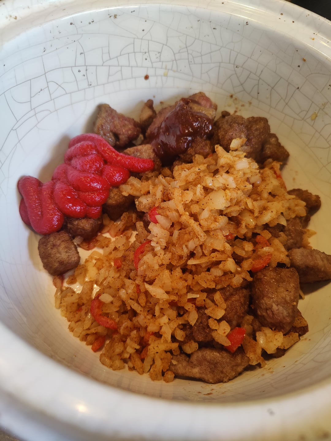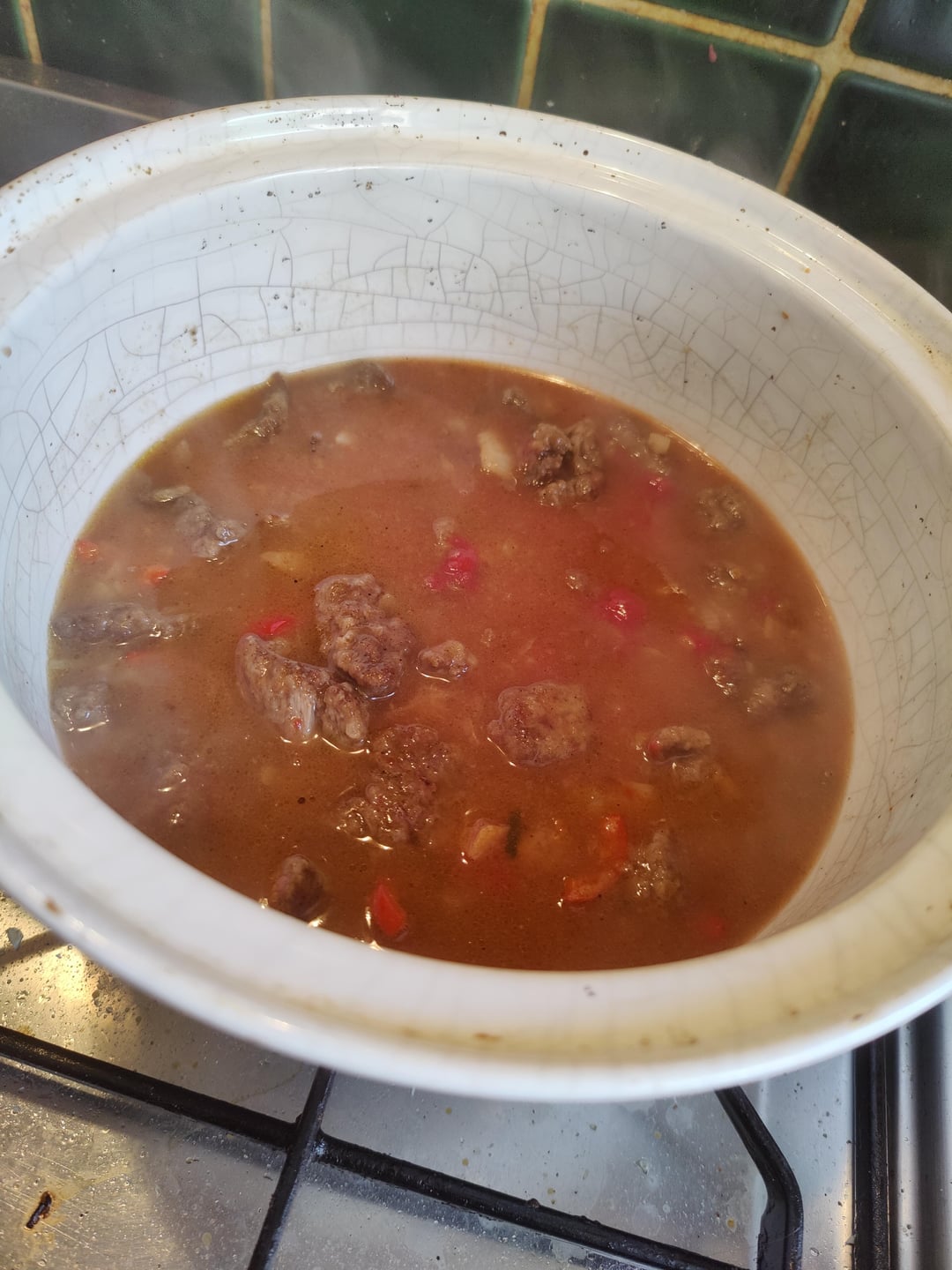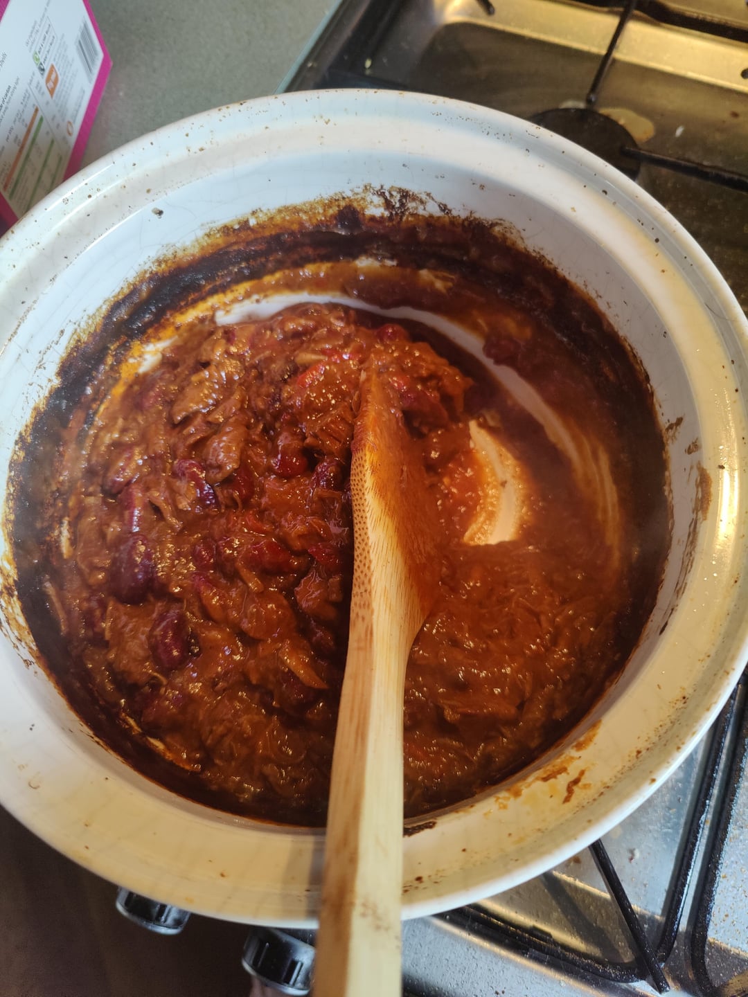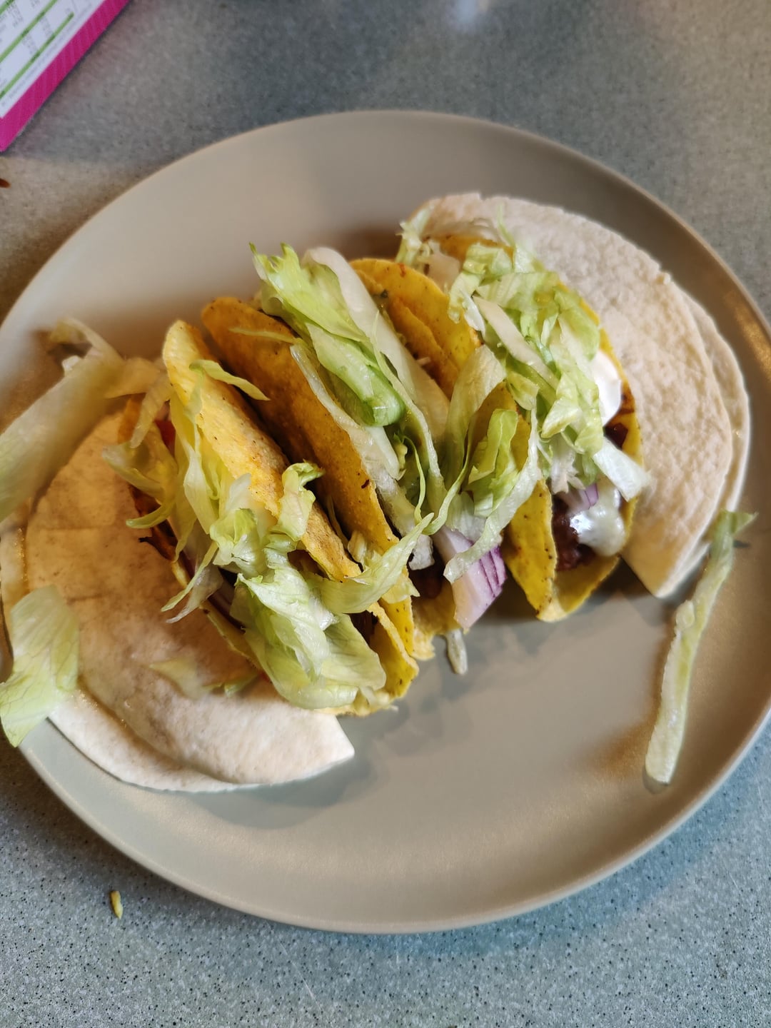 I didn't follow an actual birria recipe, just kind of went based on vibes. It's a beef skirt, onion, chilli, and kidney bean stew seasoned with paprika and cumin, with tomato puree and chipotle pate, cooked on a low heat for over six hours. Mixture of crunchy and soft tacos.