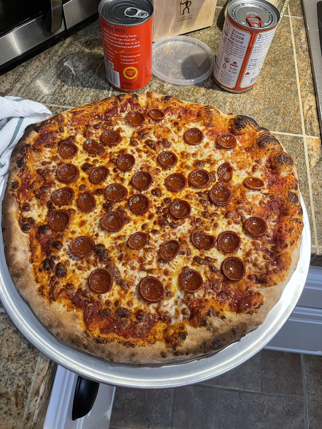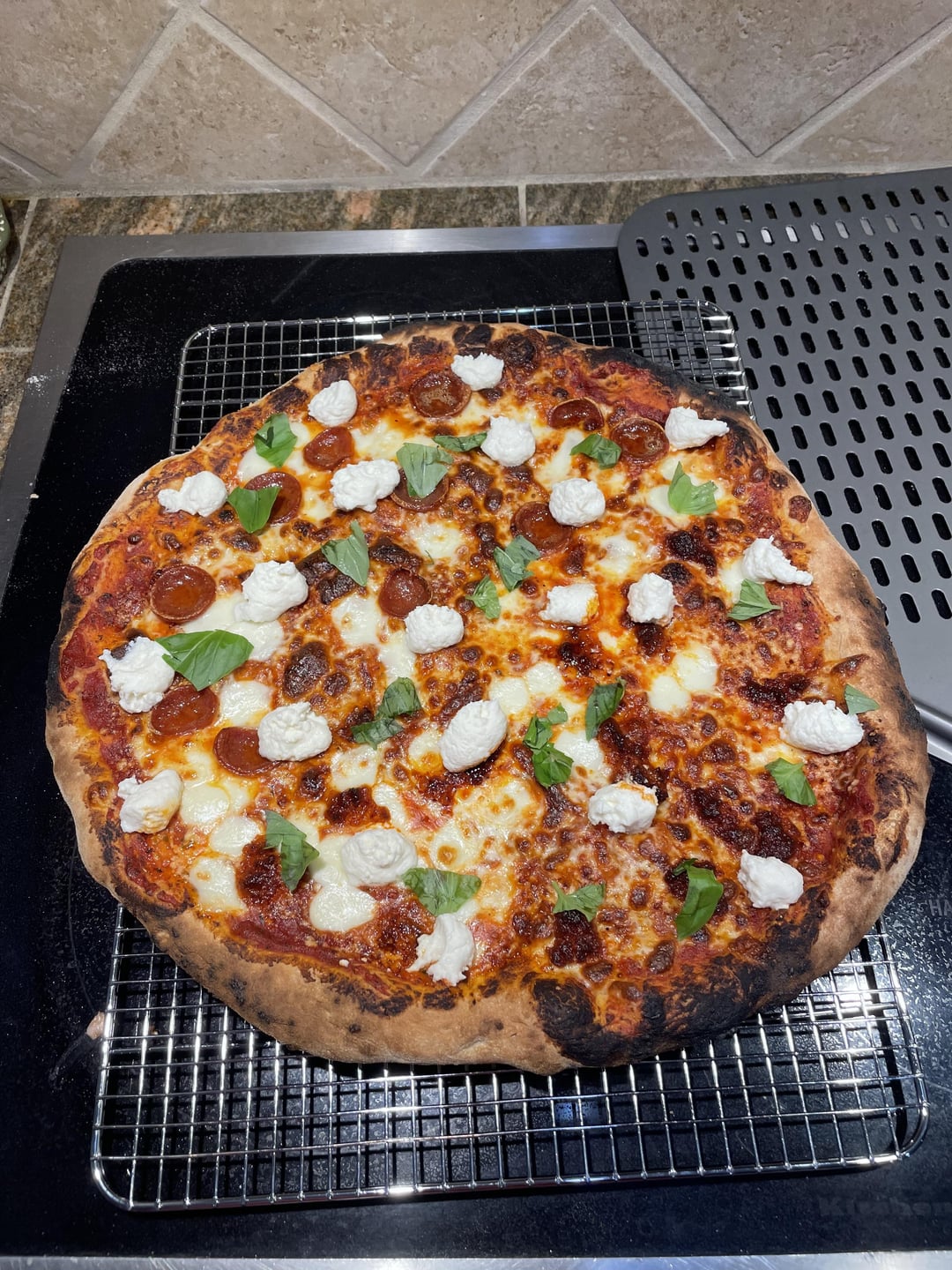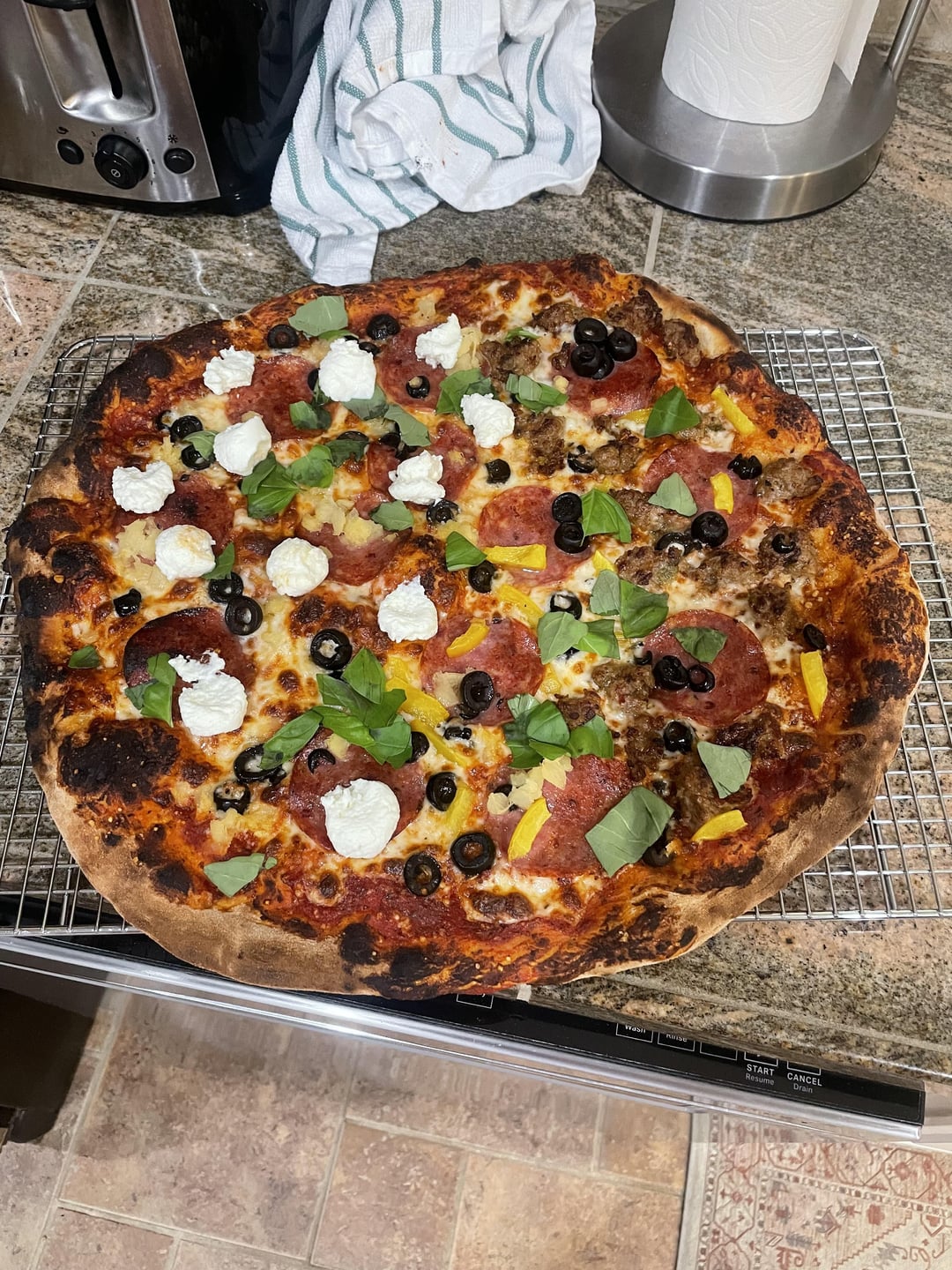 Took 3 months off from pizza making after starting a new job. Feel goods to get back into it. 16 inch pizzas, 495g dough balls on my Gozney Arc XL. Percentages on last pic.
