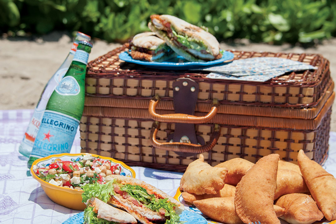 Italian cuisine goes al fresco at this beach picnic on Maui. The menu: chicken Milanese on flatbread, pasta fregola salad, and marinara and cheese-filled panzarotti.