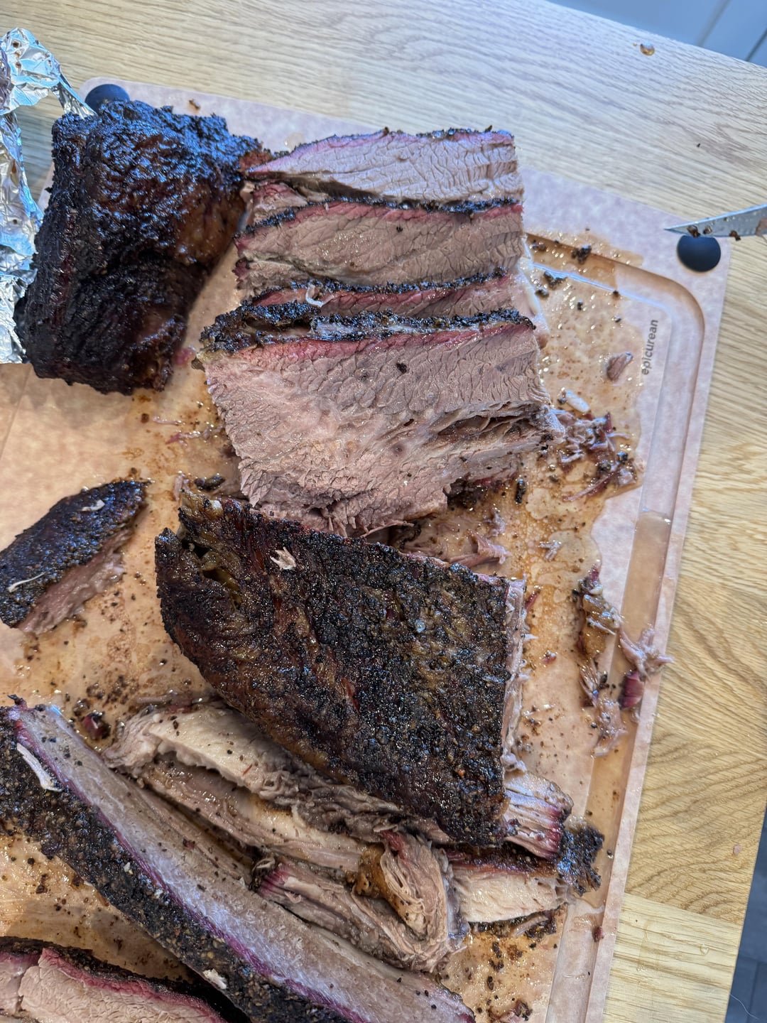 Got a Big Joe III a couple weeks ago, and have been practicing with pork ribs and decided it is time to practice a brisket. I bought a 20lb choice brisket from Costco, trimmed it myself and then let it dry brine with Meat Church Holy Cow BBQ rub for 24 hours. I had my temp between 225-250 but it definitely fluctuated over the cook, I couldn’t get it to stabilize. Also, it started stalling around 140-150 and I think I let it ride too long before wrapping it.