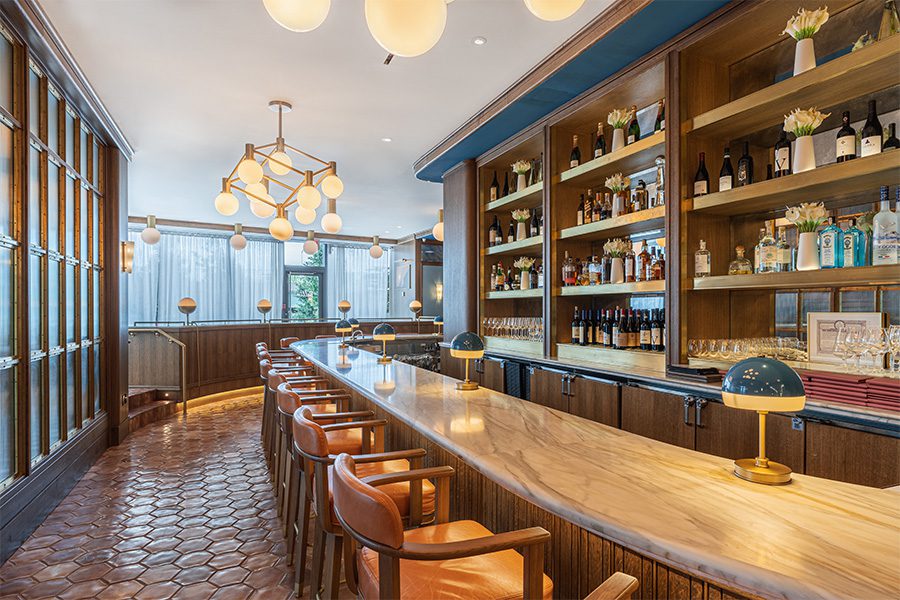 An honest materiality of timber, terrazzo, tiles, and terracotta spans Harry’s Table by Cipriani along with recurring tones of ocean blue, burnt orange, and brass that channel the hues of the Italian coastline. Statement chandeliers also illuminate native terrazzo flooring—a nod to New York subways—while terracotta flooring accents infuse a relaxed but refined edge. Accented by leather stools and sleek light fixtures overhead, a timber-clad bar reminiscent of the glamour of midcentury Italy also anchors the interior.
