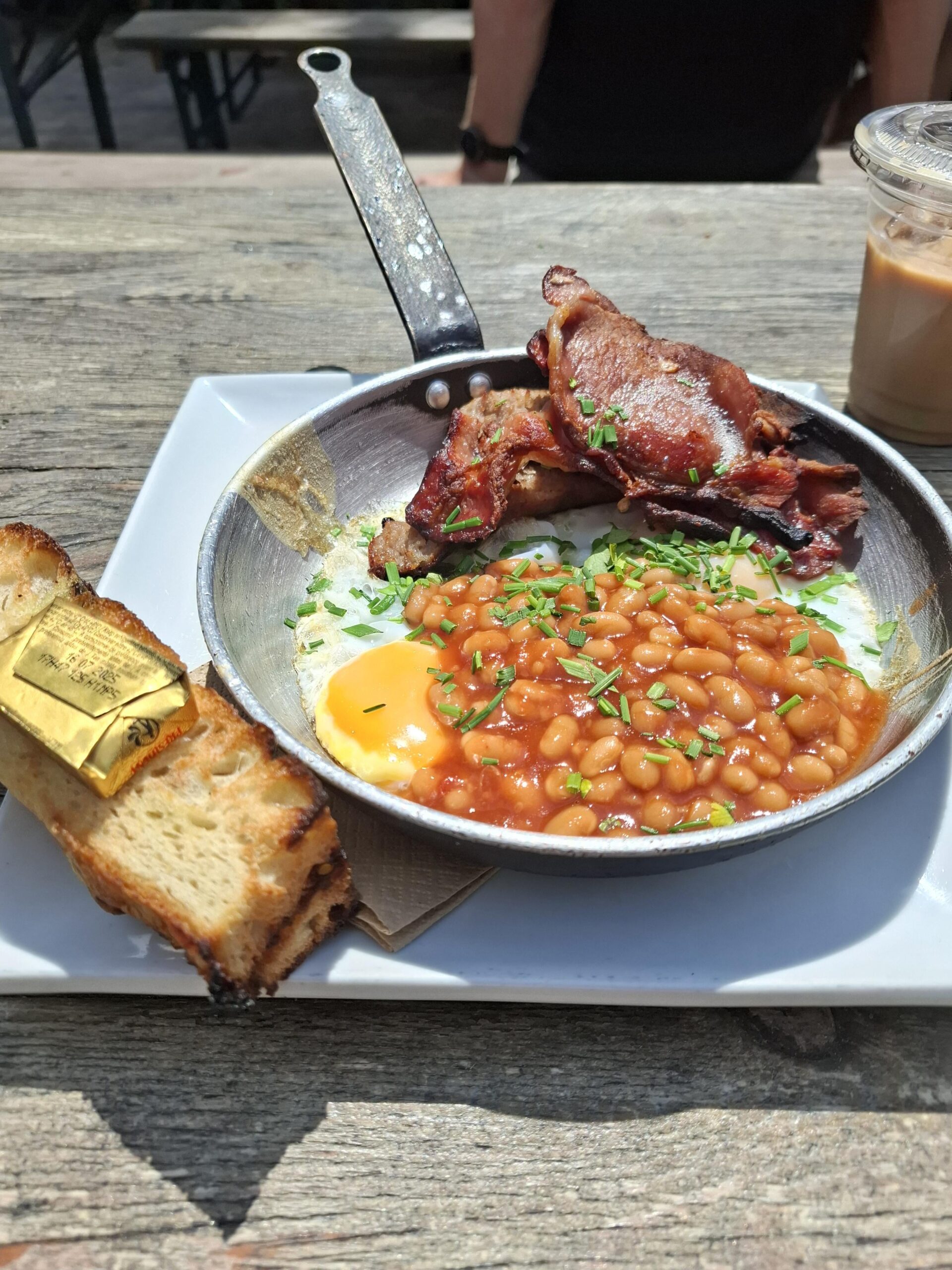 Looks awful. Bacon cremated. Is that a sausage hiding under the bacon? Too many beans which are still cooking the egg underneath. For me would be nice to have less beans and some mushrooms and half a grilled/ fried tomato but I guess that is down to the price.