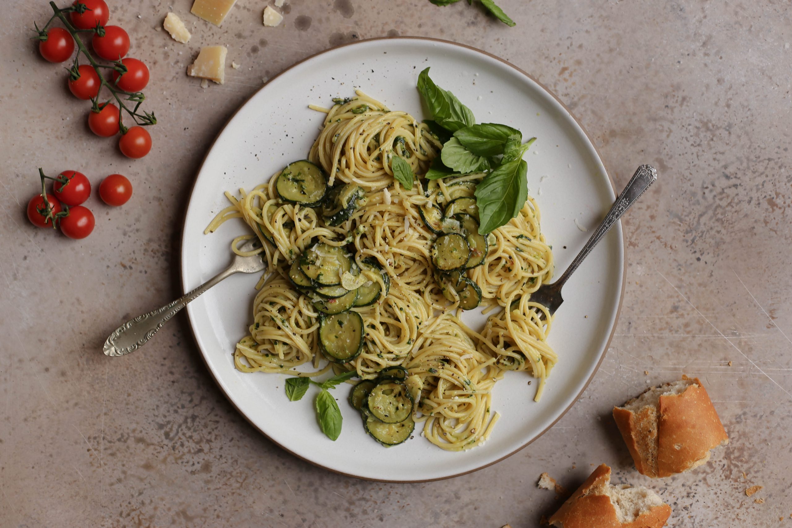 While I welcome you to try the frying method mentioned above because it is delicious, I’ve been pan sautéing the zucchini slices with some shallot—not traditional—and garlic, until they take on just a shade of gold. You then take about a third of the zucchini and add to a blender with a little pasta water, and basil—also not traditional—for the sauce. Bring everything together with a pat of butter and some grated parm and you have a winner. Even my dad who is Mr. Picky Eater was a fan!