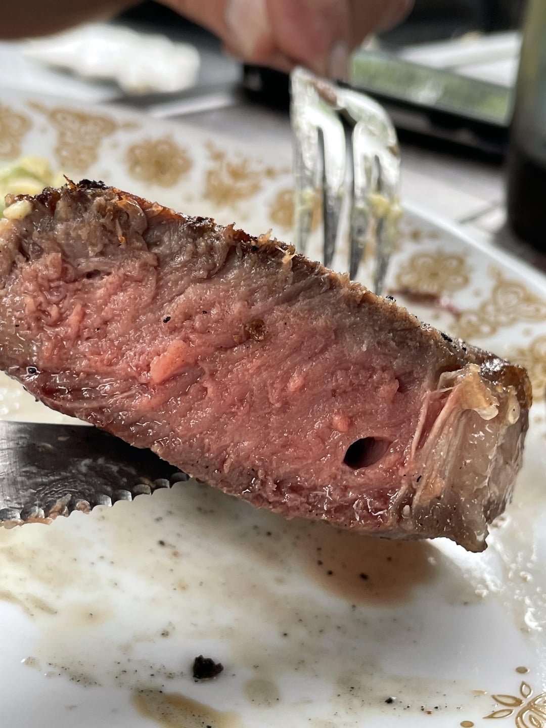 The infamous probe hole. If you insert from the side, you should end up with only one slice with a hole when cutting across the grain. Looks great otherwise. Happy Father’s Day.