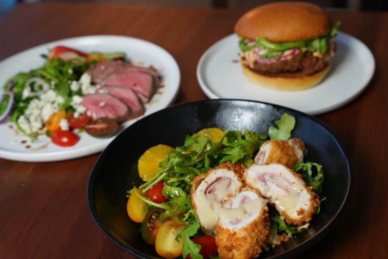 From top left clockwise, lunch options at Hapa Bistro include grilled tri-tip Caesar salad, crispy chicken sandwich and rotating special chicken cordon Bleu ($16.95-$19.75). Courtesy Hapa Bistro.