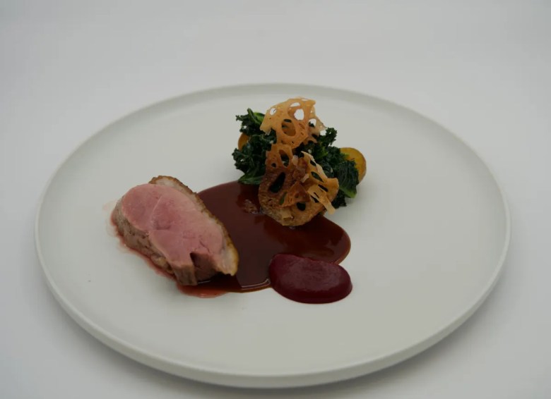 Hapa Bistro’s current prix fixe dinner menu includes a main course of duck roast with potato, kale, beet puree, lotus root chip and port wine sauce. Courtesy Hapa Bistro.