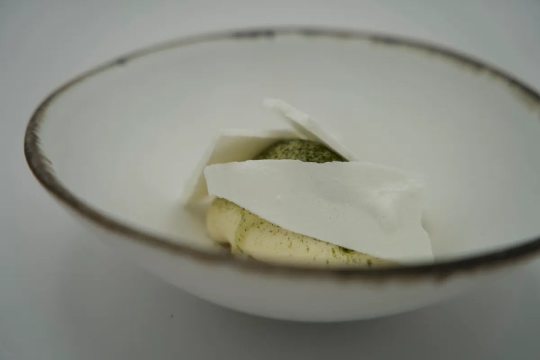 Hapa Bistro’s former prix fixe dinner menu came with a dessert course of matcha ice cream with cream diplomat, orange, cocoa nibs and meringue.