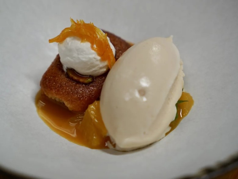Hapa Bistro’s current prix fixe dinner menu comes with a dessert course of pistachio petite cake, homemade condensed milk ice cream, orange and cream. Courtesy Hapa Bistro.