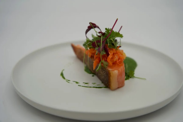 Hapa Bistro’s current prix fixe dinner menu includes a first course of Atlantic trout with spinach purée, pineapple and carrot salad and yuzu kosho. Courtesy Hapa Bistro.
