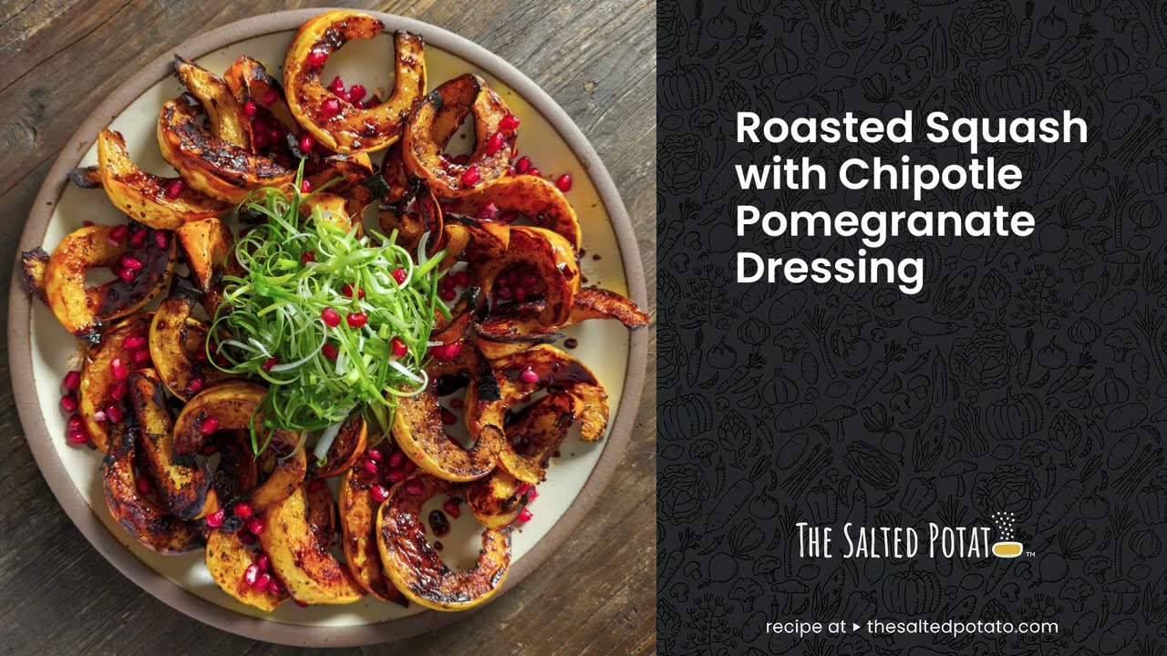 Get my recipe at: https://thesaltedpotato.com/roasted-squash-with-chipotle-pomegranate-dressing/