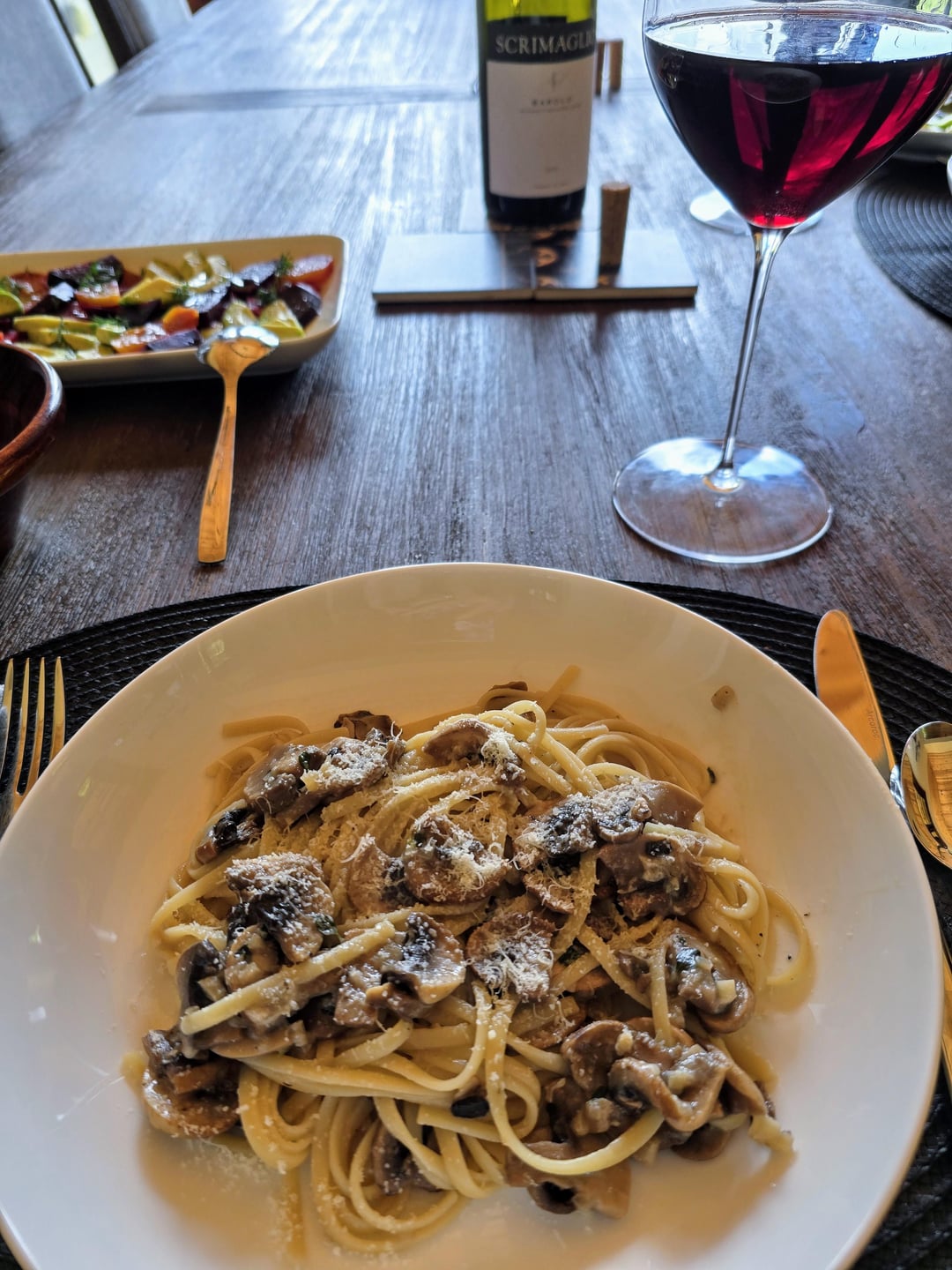 These gorgeous beets and giant asparagus came in a gift basket. What a great surprise! I’d never seen asparagus this thick before… and it turns out they were the best I’ve ever tasted. Just roasted at 400°F for about 15 minutes. I served the roasted beets with avocado, simply dressed with white balsamic, olive oil, salt, and pepper. Perfect sides for a cozy pasta and mushroom dinner.