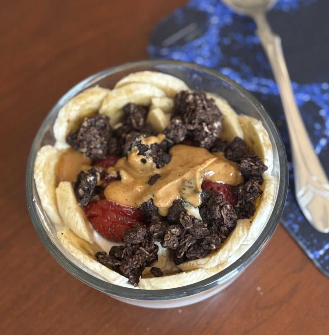 (4) Easy yogurt bowls. This week’s mix included creamy plain Greek yogurt, strawberries, bananas, chocolate coffee granola, a little natural peanut butter, and a touch of local honey.