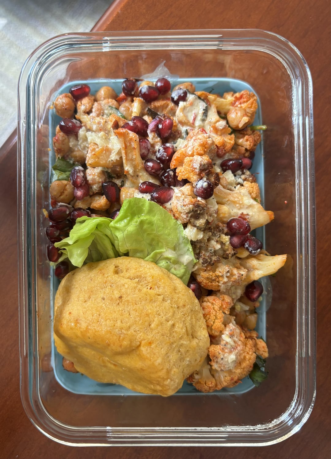 (1) This harissa-spiced cauliflower and chickpea salad. So, so tasty when topped with that dressing and some pomegranate seeds.