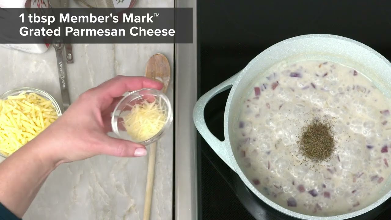 [Music] make this Weber garlic parmesan Brussels sprouts graten Preheat the oven to 400° Spray an 8×12 casserole dish with Pam non-stick spray Take 16 oz of washed brussel sprouts Trim the outer leaves and slice in half Place in the casserole dish and add two tablespoons of Weberg garlic parmesan seasoning Then spray Pam non-stick spray over the Brussels sprouts Place in the oven and bake for 15 minutes Meanwhile chop 1/3 cup of shallots Melt 1/2 tbsp of butter in a pan over medium heat Then add the shallots and stir until translucent Add 2 tsp of allpurpose flour and whisk together Incorporate 3/4 cup of milk and stir with a wooden spoon Cook over medium heat for about 4 minutes stirring until the sauce thickens Now add 1/4 teaspoon of Members Mark sea salt 1 teaspoon of Members Mark thyme leaves 1 tbsp of Members Mark grated Parmesan cheese and half of the grated griier cheese Stir until the cheese is melted and incorporated into the sauce After it has cooked for 15 minutes pour the sauce over the Brussels sprouts and top with the remaining griier cheese Then bake for another 15 minutes until the top is lightly browned and bubbly This is a wonderful side this fall for the holidays [Music]