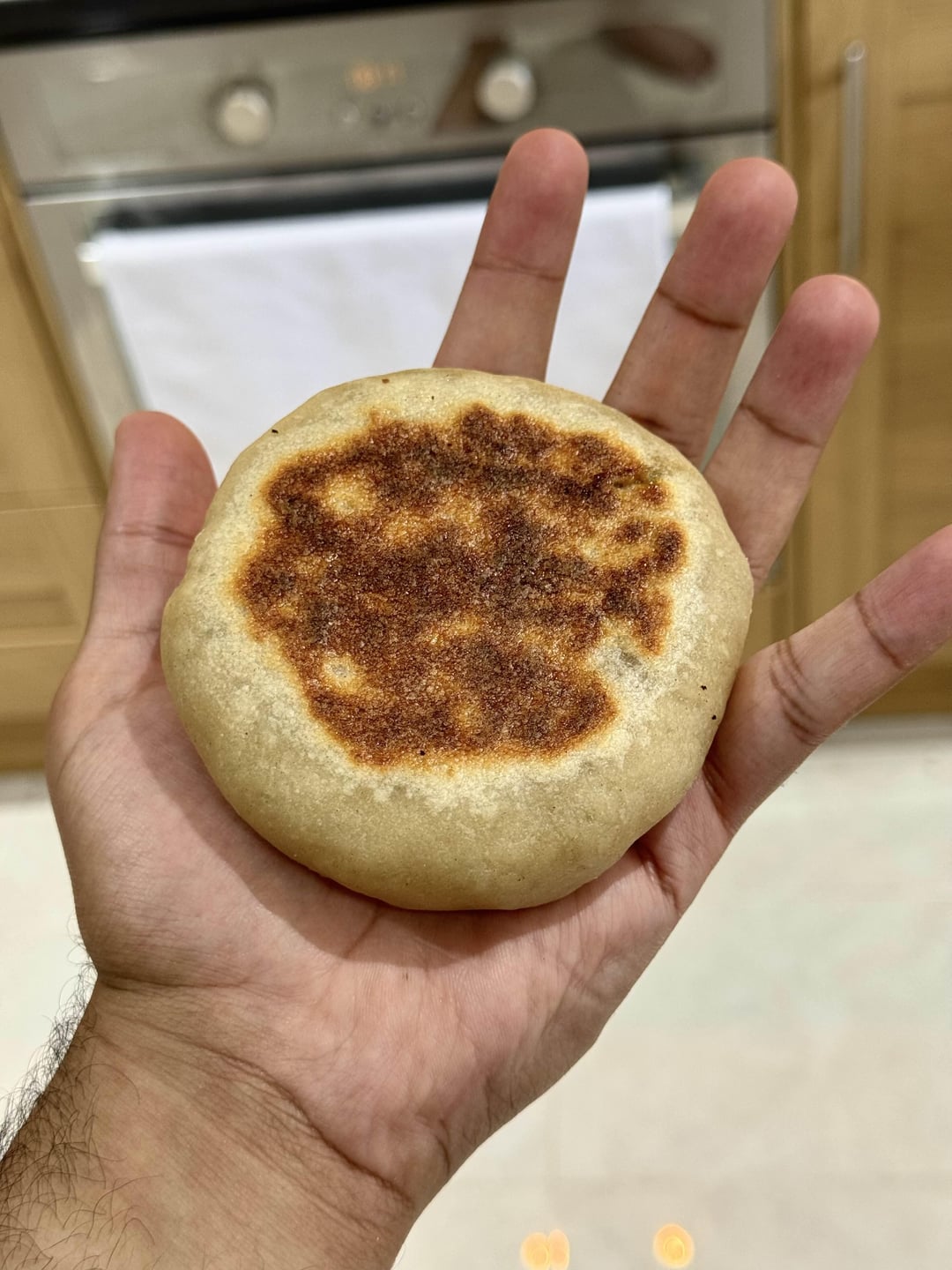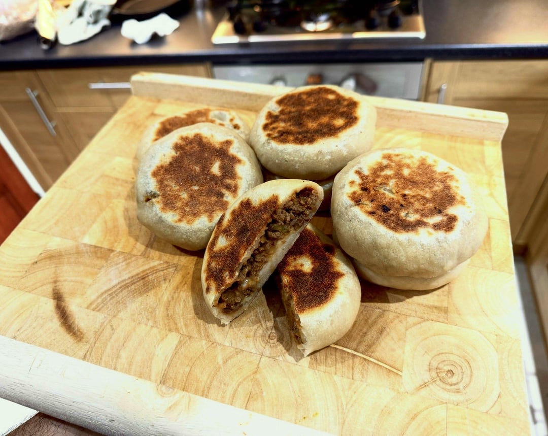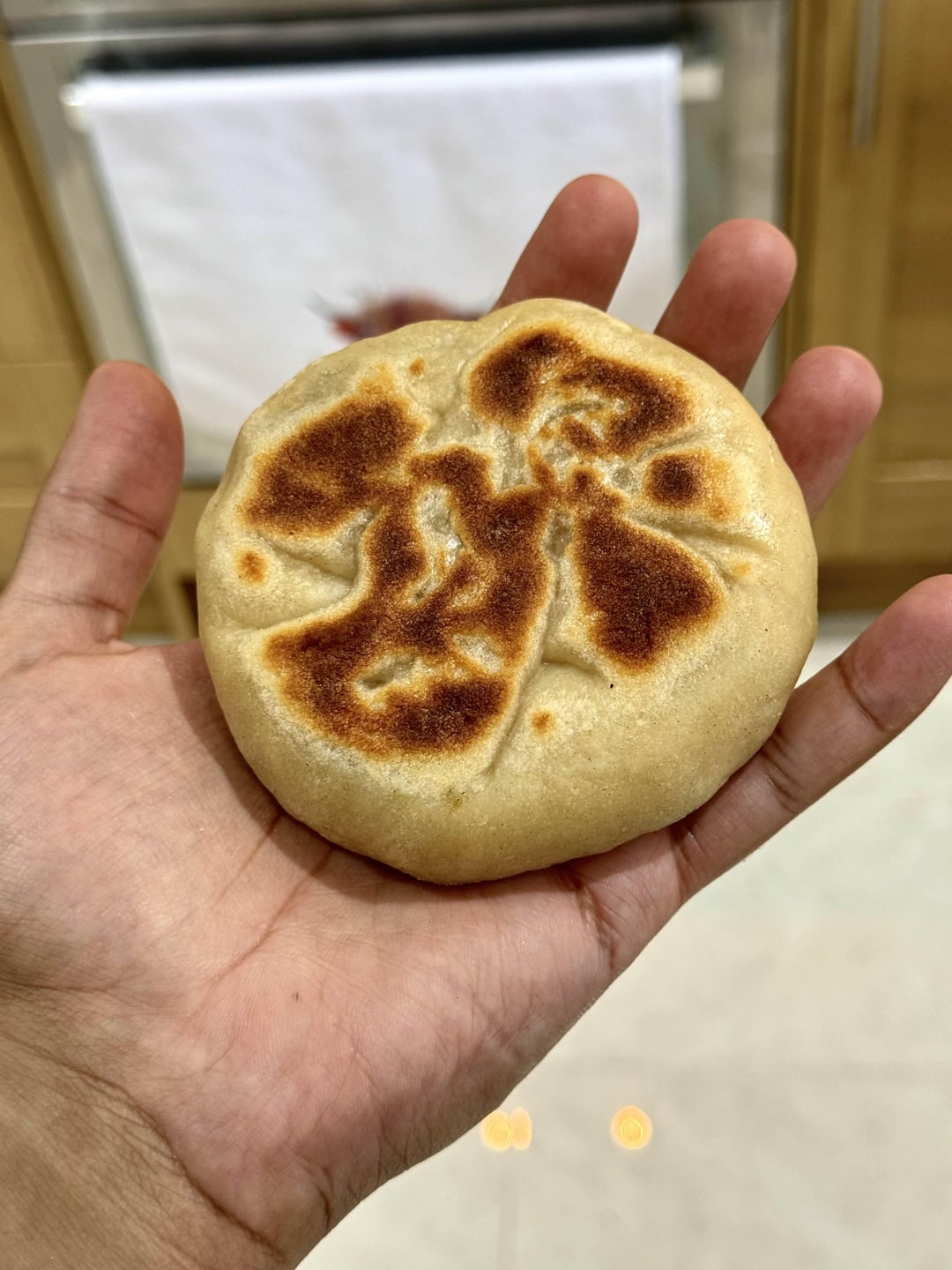 Tip: If you try these and you haven't made buns or dumplings before, make sure the outer edge where you pinch the dough together is thinner than the centre, otherwise you will get a build up of dough (still edible since you steam the buns in the pan, and heat them up afterwards). Also fry the buns on low heat.