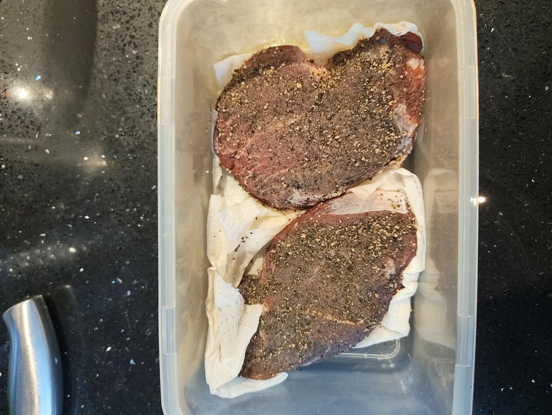 Method: I dry brined them both in salt and pepper for a few hours (and the meat tenderiser for one of them). I then got a non stick pan, put a bit of oil, and cooked them til I felt they were done