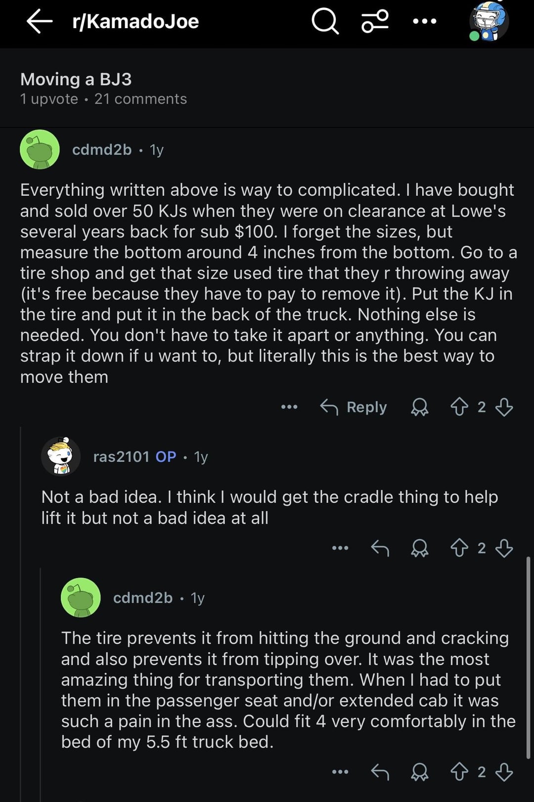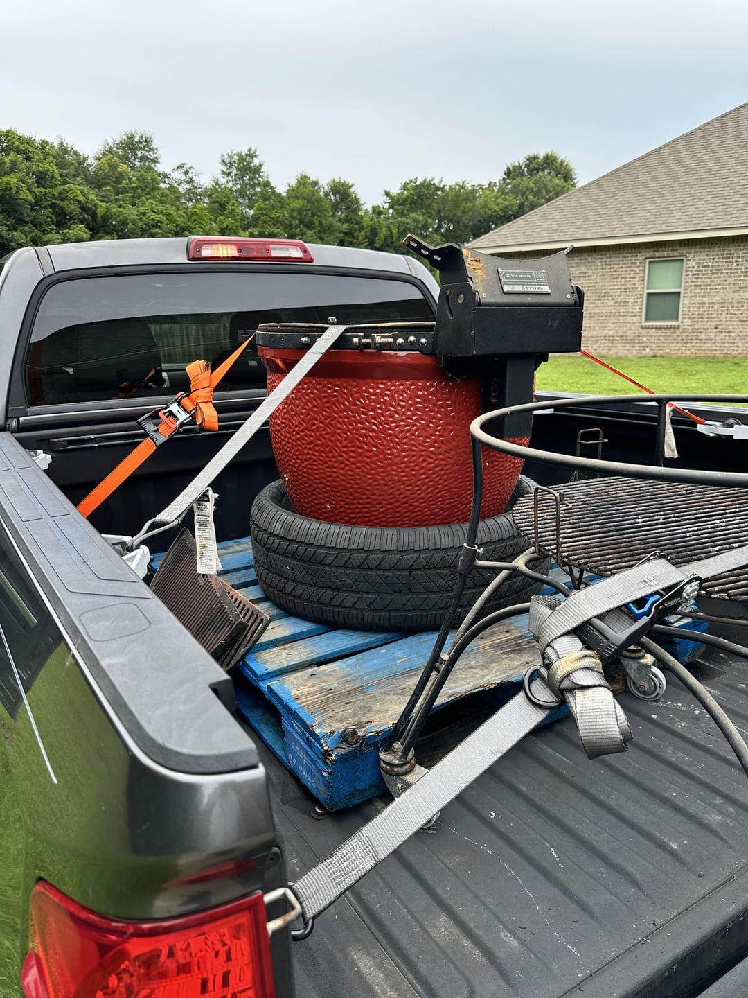 After hours of research, I found 1 solution that sounded viable and it was from u/cdmd2b who mentioned moving a Big Joe on top of a tire was the best option. I couldn’t believe how simple, yet innovative that it sounded. The big girl barely even wobbled in my hour long commute to my home. That’s right, I followed a random redditor with 2 upvotes and put my $2000 grill on the line because of his advice.