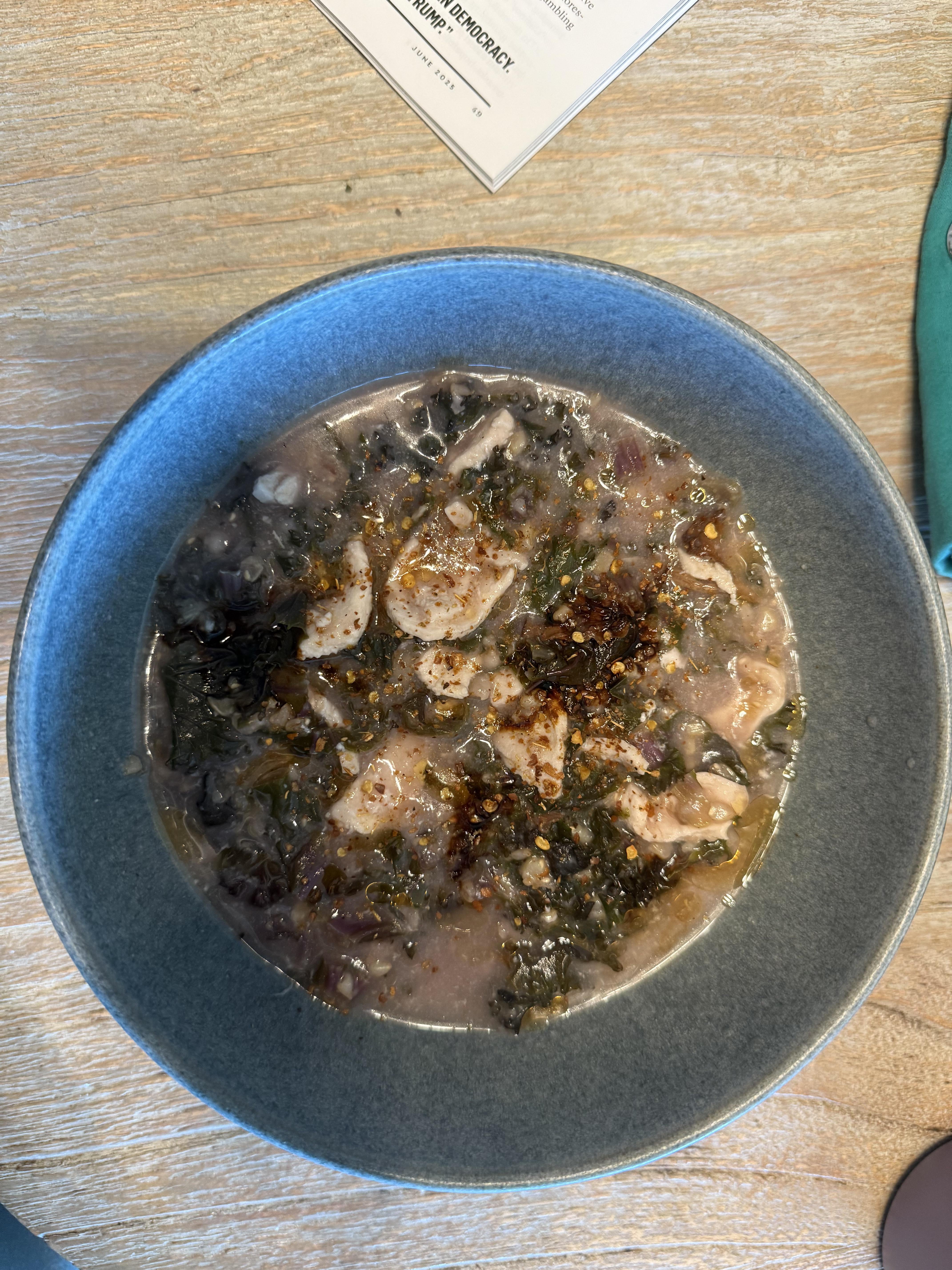 I steamed the kale quickly and added it to the pot with thinly sliced chicken breast. That cooked for a few minutes on medium till the chicken was done.