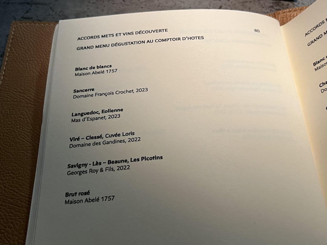 18/ List of wine pairings; a champagne to start, then four different wines, then a final pink champagne with dessert to finish.
