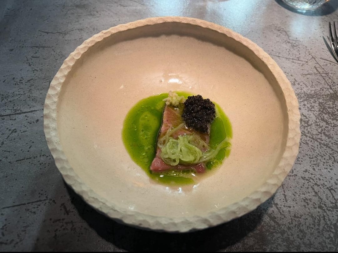 7/ Raw tuna with cucumber, horseradish, and caviar, in a herb vinaigrette.