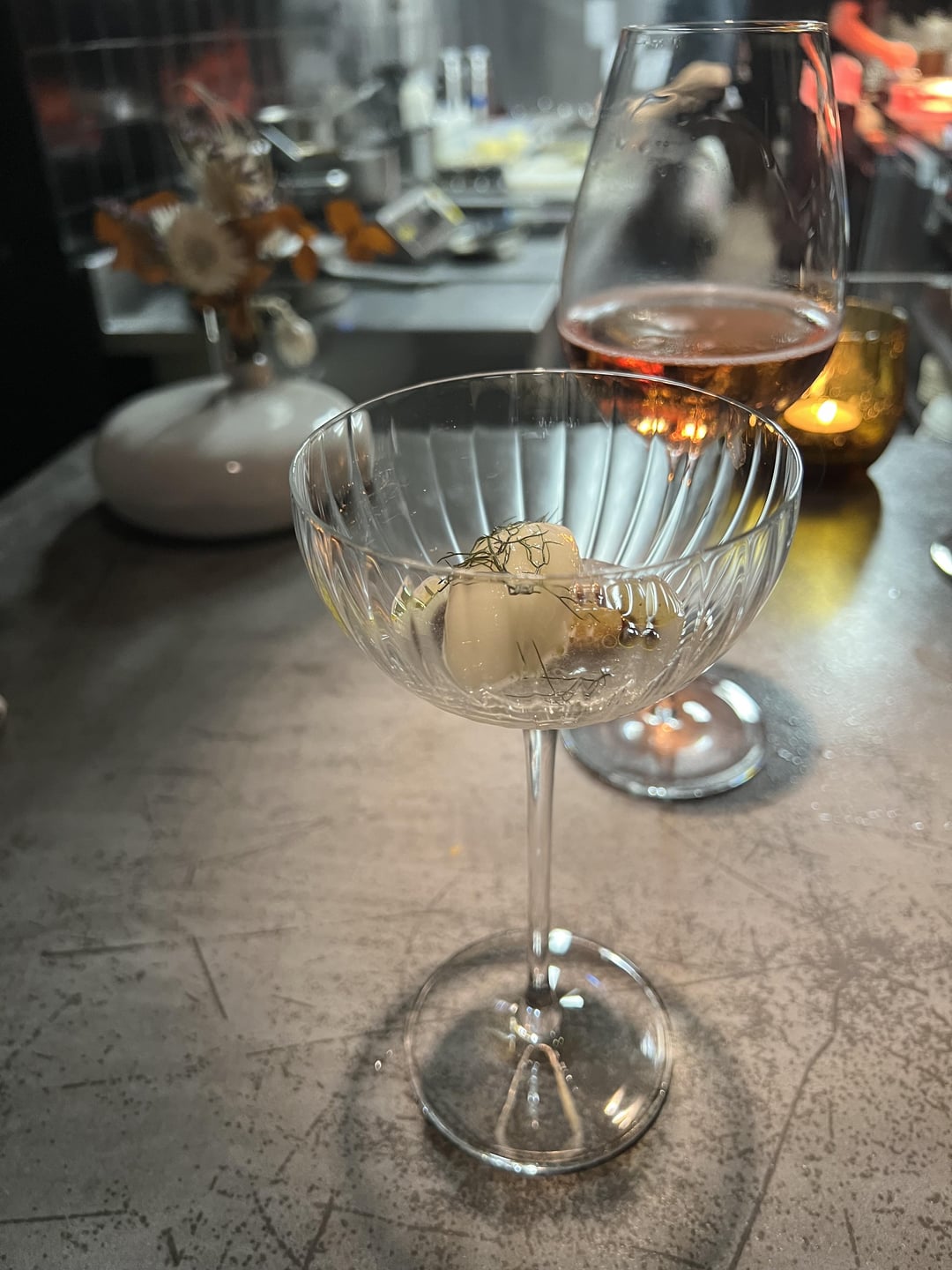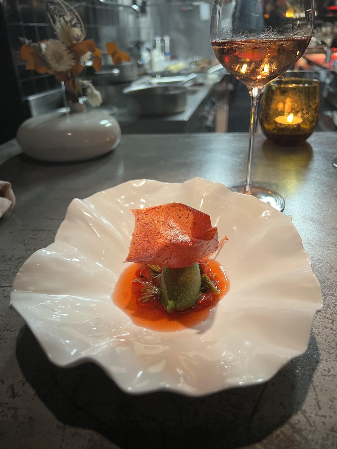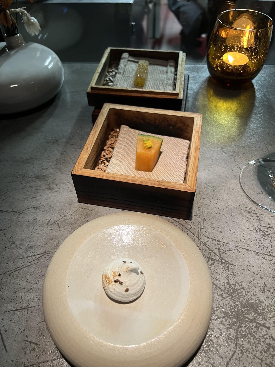 They have their normal dining room too, but I went for the “Grand Discovery Menu” with wine pairings at their Guest Counter. It’s a bar / counter around the kitchen area and only one seating of 9 guests each evening; you get many small courses, you don’t know the menu in advance, and you take your time and leave it to them to show you what they do.