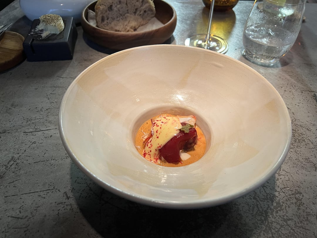 9/ Langoustine and beetroot with two sauces made from their shells.