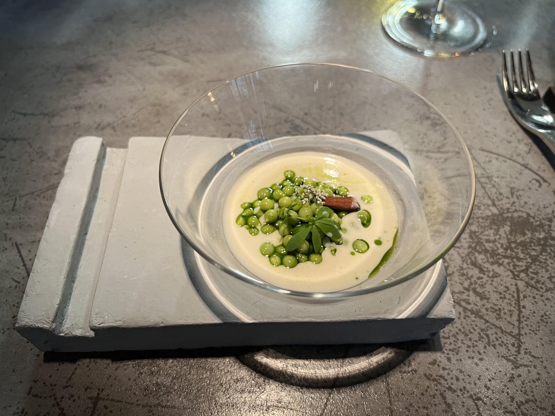 6/ “Raw peas”; peas in a creamy white wine soup with spices and a herb oil.