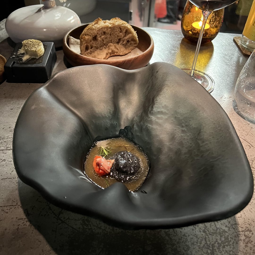 11/ Black squid ink raviolo filled with squid and crab in tomato water.