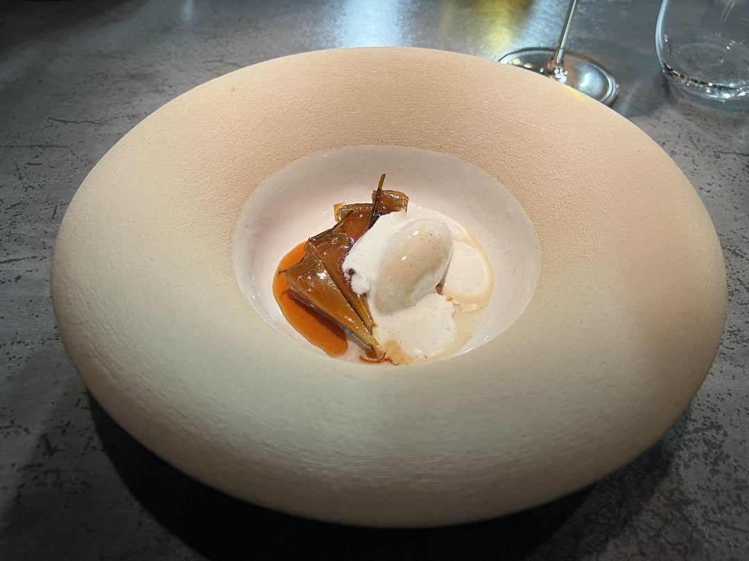 16/ Caramelised artichoke dessert with French vanilla ice cream and a caramel sauce.