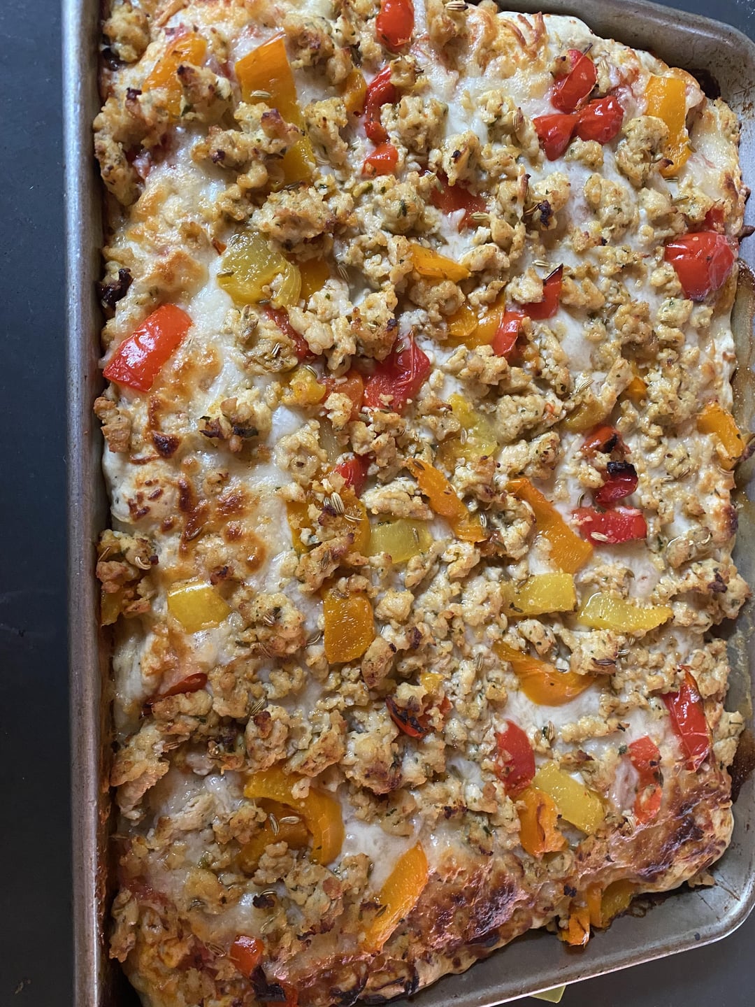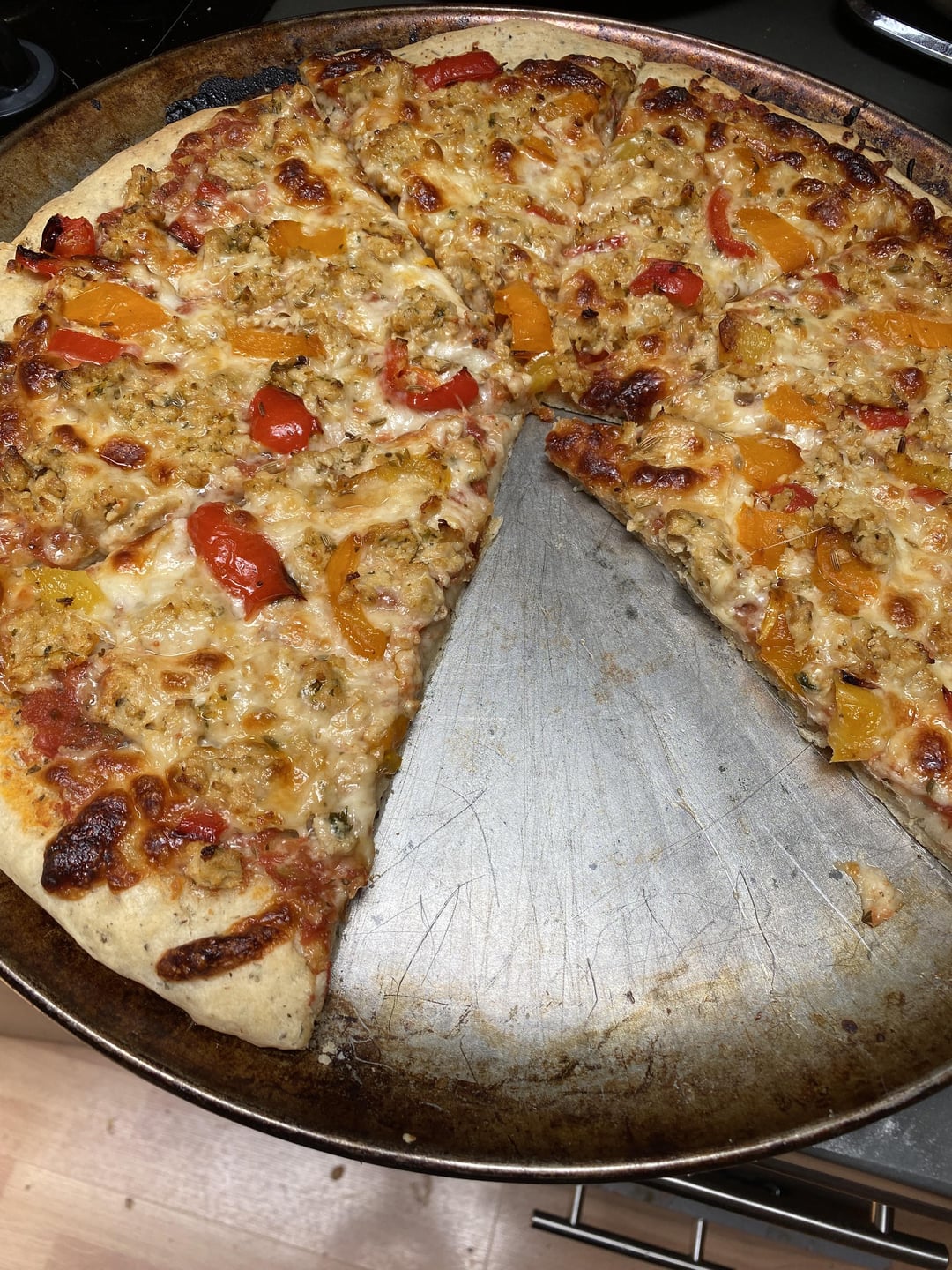 I have to eat low sodium and was missing pizza. I doubled the dough recipe, flavored with garlic and basil and cut the salt in half. Meat is ground chicken flavored with Italian spices, I added Trader Joe's Oglio Olio to add more flavor. Sauce is unsalted tomatoes, garlic, basil, oregano and fennel. 2 C of mozzarella cheese for both. Oven roasted peppers. Round pizza for lunch/dinner and the other to freeze in squares. Pizza dough recipe from Preppy Kitchen.