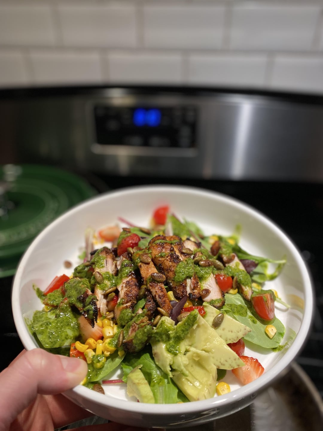 itsReferent 9 months ago More details please, looks great. How you pastor that chicken, what’s the dressing, that spinach, pumpkin seeds, avocado, pesto? Getting hungry..