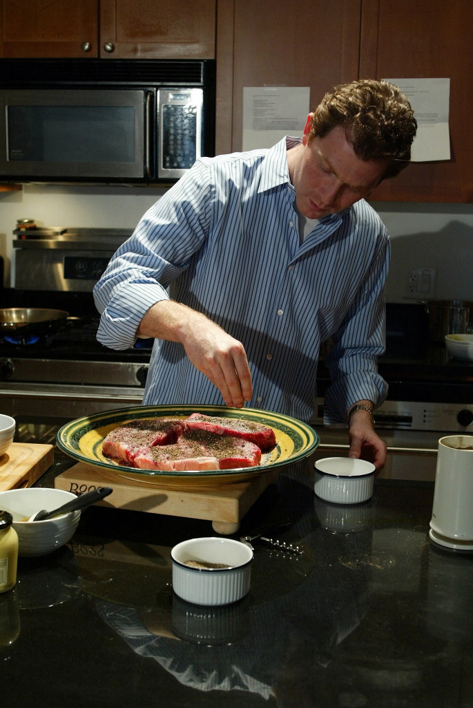 - Heat oven to 425 degrees. In a small bowl, combine black pepper, red pepper flakes and salt. Rub one side of each steak with the mixture.