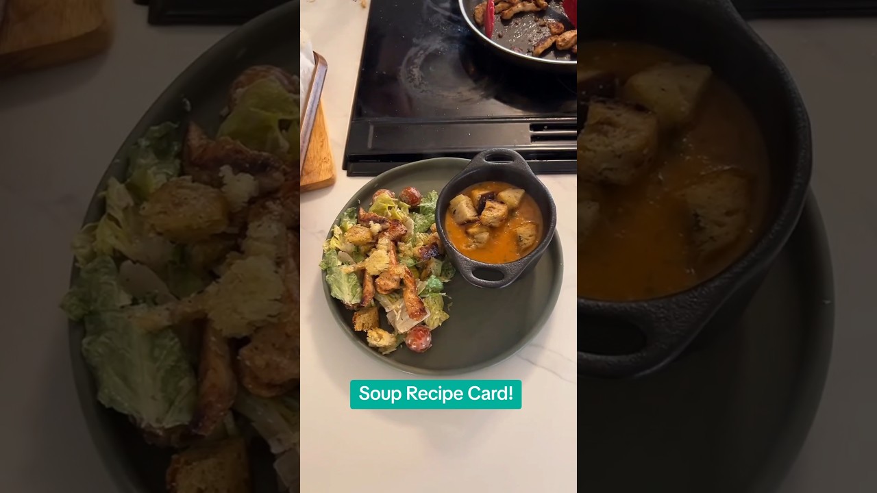 we’ve got a lovely our sourdough croutons And then I’m going to find some of the big ones and we’ll top off our soup with our beautiful croutons Well guys this is our lunch today We have our yummy creamy Italian salad of grilled or sauteed chicken and creamy tomato basil soup