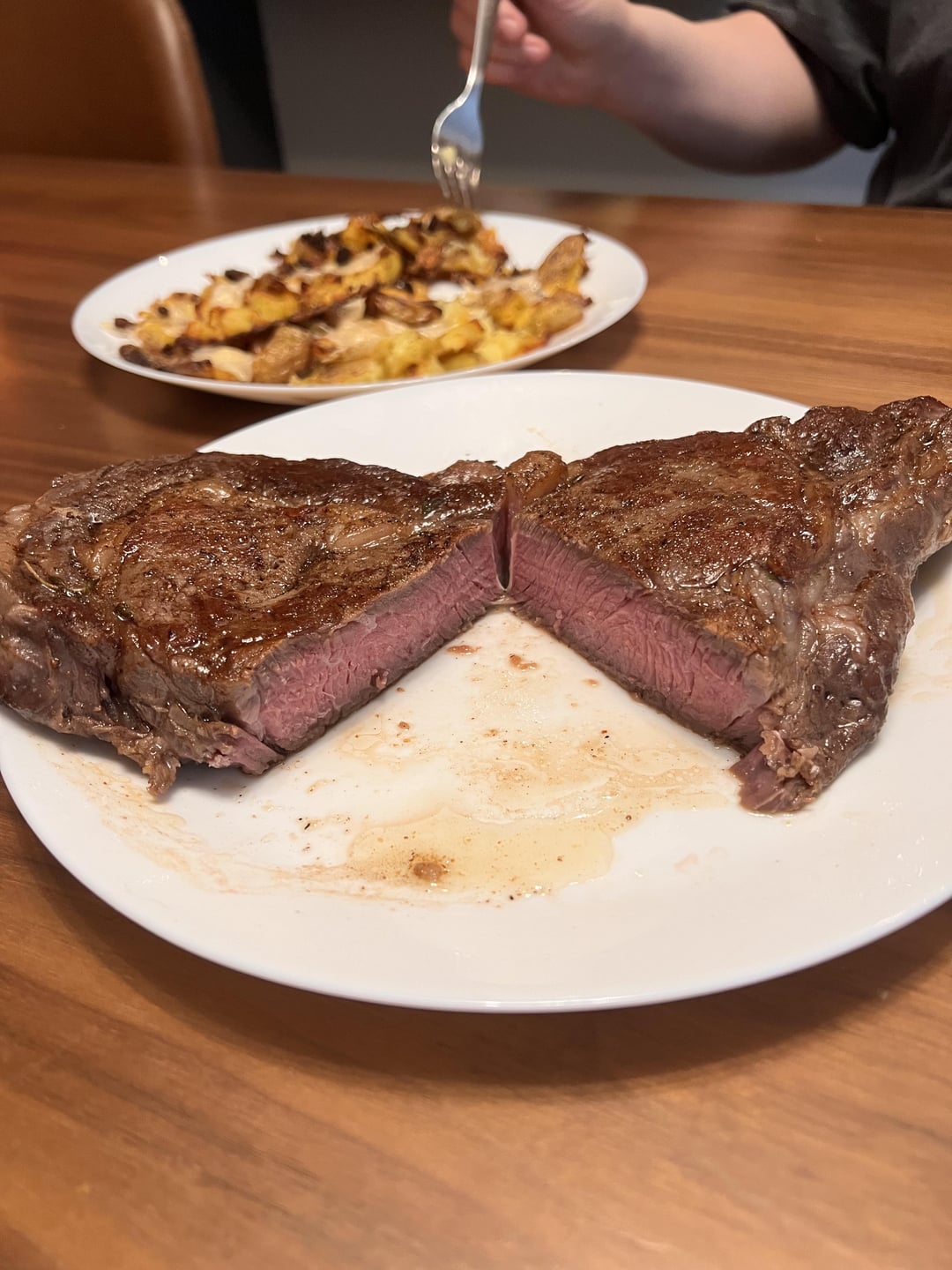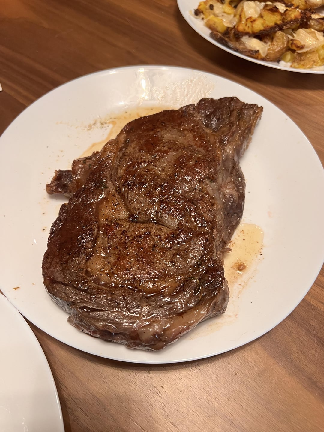 Cooked a 24 hour dry brine ribeye at 137 for 2.5 hours then seared on cast iron. Probably cooked on cast iron a little long leading to grey banding but still delicious over all!
