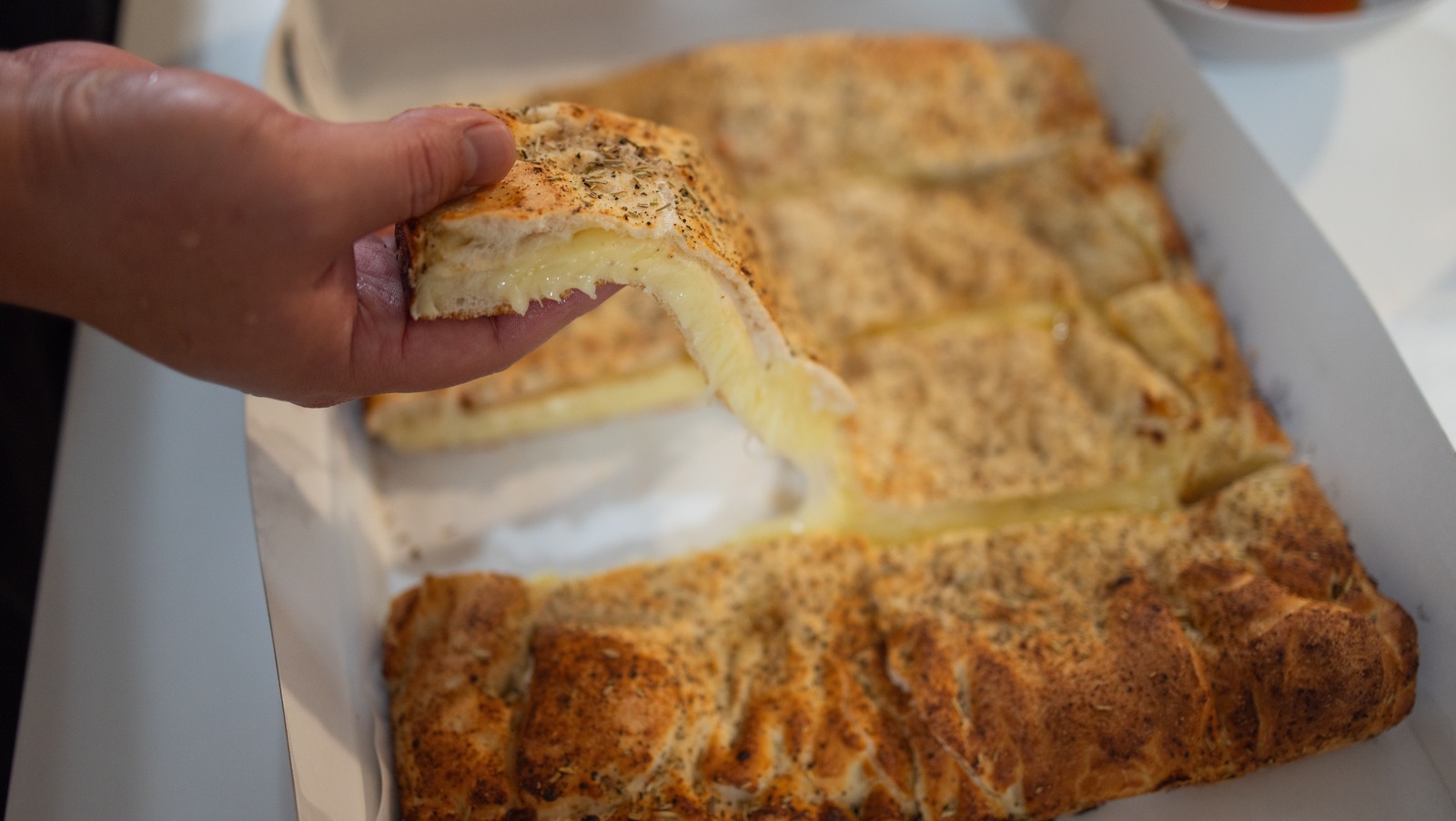 A pan-fried Sicilian also comes sliced into squares, but this time you buy the cuts individually. The Sicilian looks different, too. The dough is proofed and pressed before being brushed with tomato sauce and baked in a pool of peanut oil, creating a glistening, golden texture. Wisconsin white cheddar cheese is sprinkled on top, making for a crunchy delicacy with an airy center that’s akin to a particularly crispy focaccia.