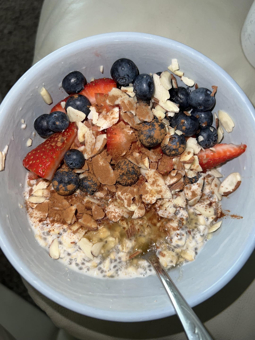 6.) oats w/ chia, blueberries, strawberries, pumpkin seeds, cinnamon, spoonful of local honey