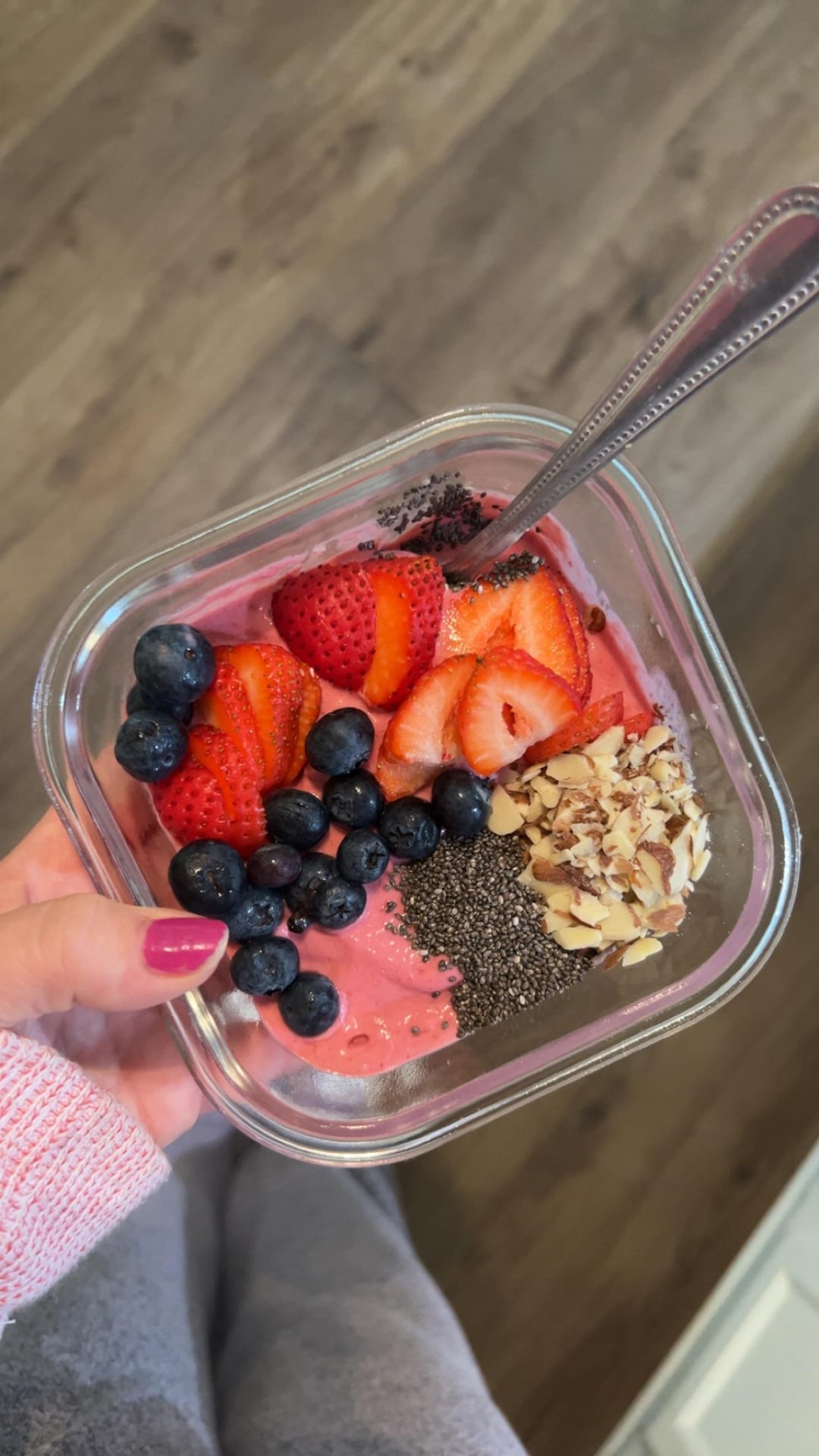1.) raspberry smoothie bowl w/ chia, almonds, strawberries & blueberries