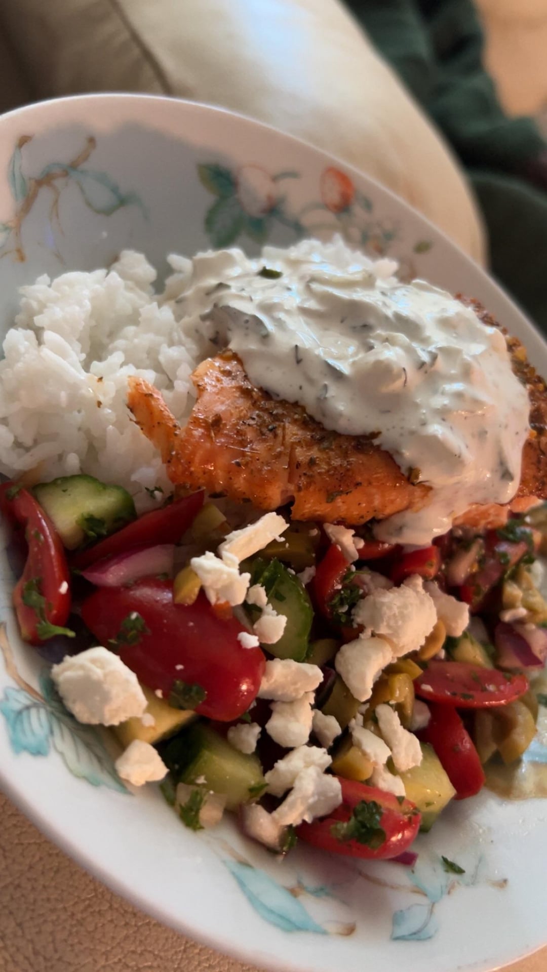 7.) salmon, rice, tzatziki, cucumber/tomato salad w/ feta cheese