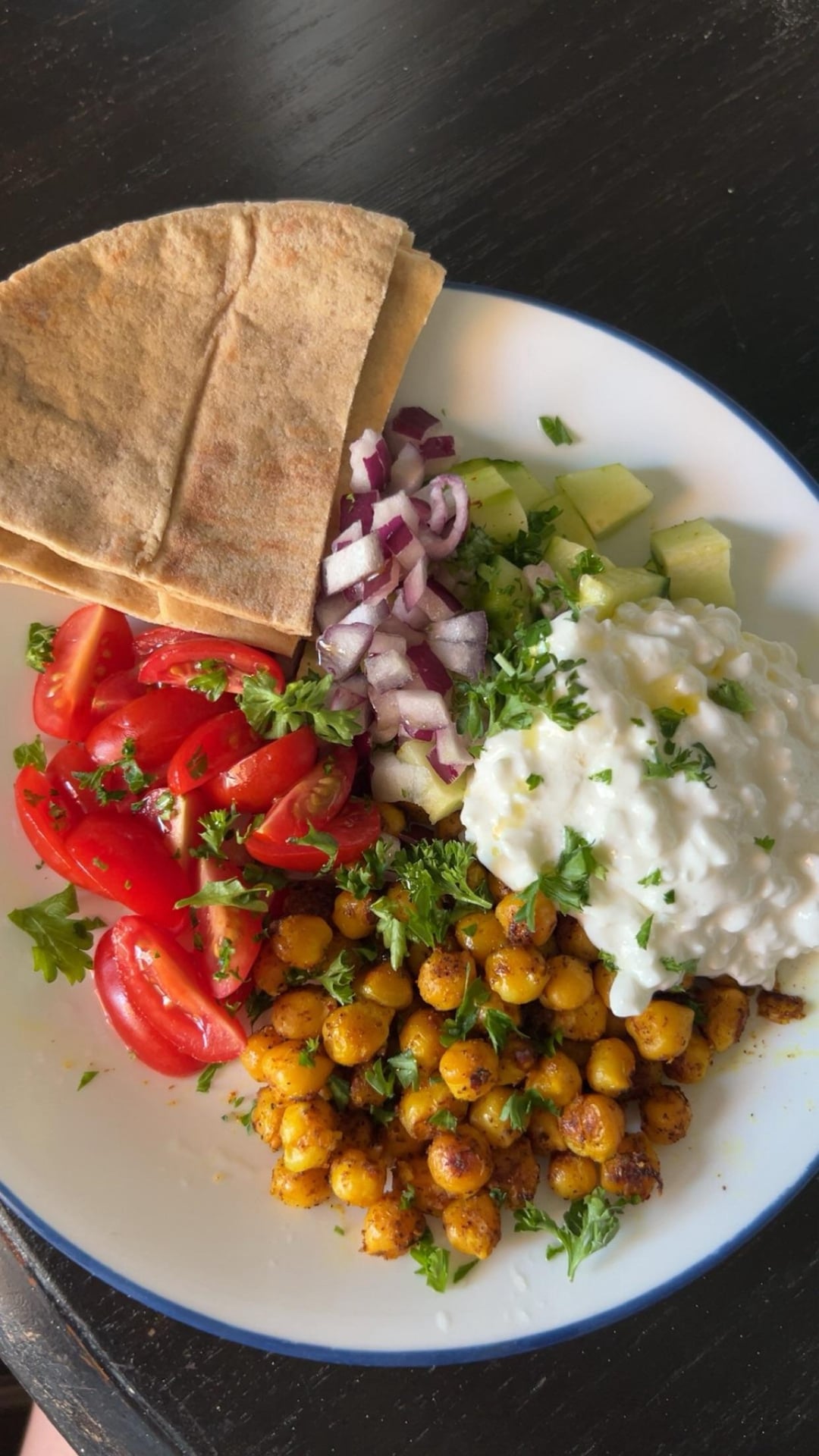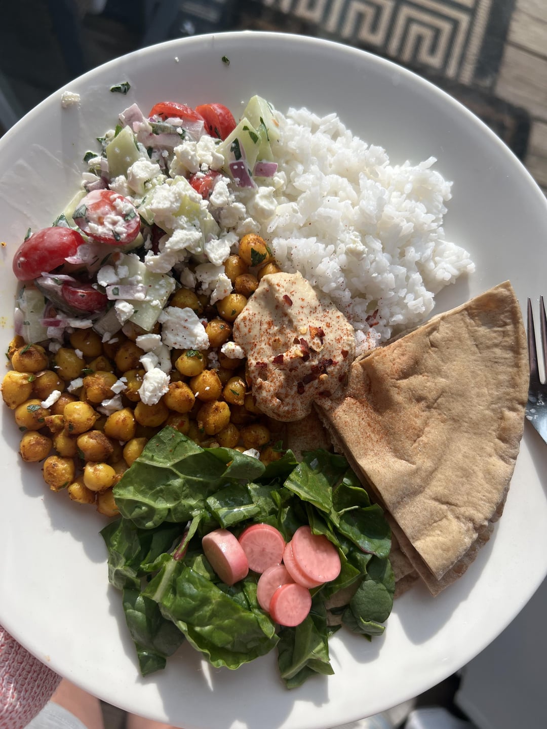 2.) randomness lol – chickpeas, mixed greens w/ pickled radishes (homegrown), whole wheat pita, hummus, rice (not compliant I'm assuming?), tomato/cucumber tzatziki salad
