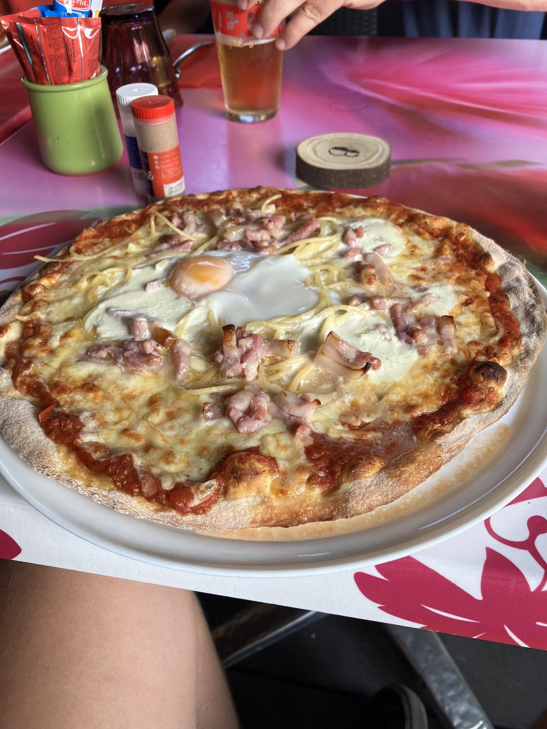 Imma be honest. Egg on pizza is not to my taste but we do see them and it’s a thing in Italy too. Those are bacon cubes or lardons, so I’m guessing the pizza was named Carbonara, a homage to the Italian dish. So far, so good. I’m pretty sure I’ve seen this in pizzerias in Italy while growing up.