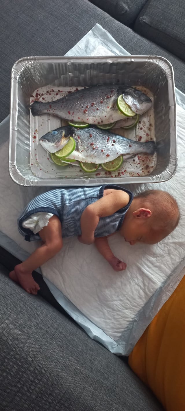 Finally decided to try grilling fish so I got us two big (newborn son for scale) seabreams and went for it. Seasoned about 2 hours before grilling: lime juice and honey, lime, pink pepper, sesame, lemon-tyme.