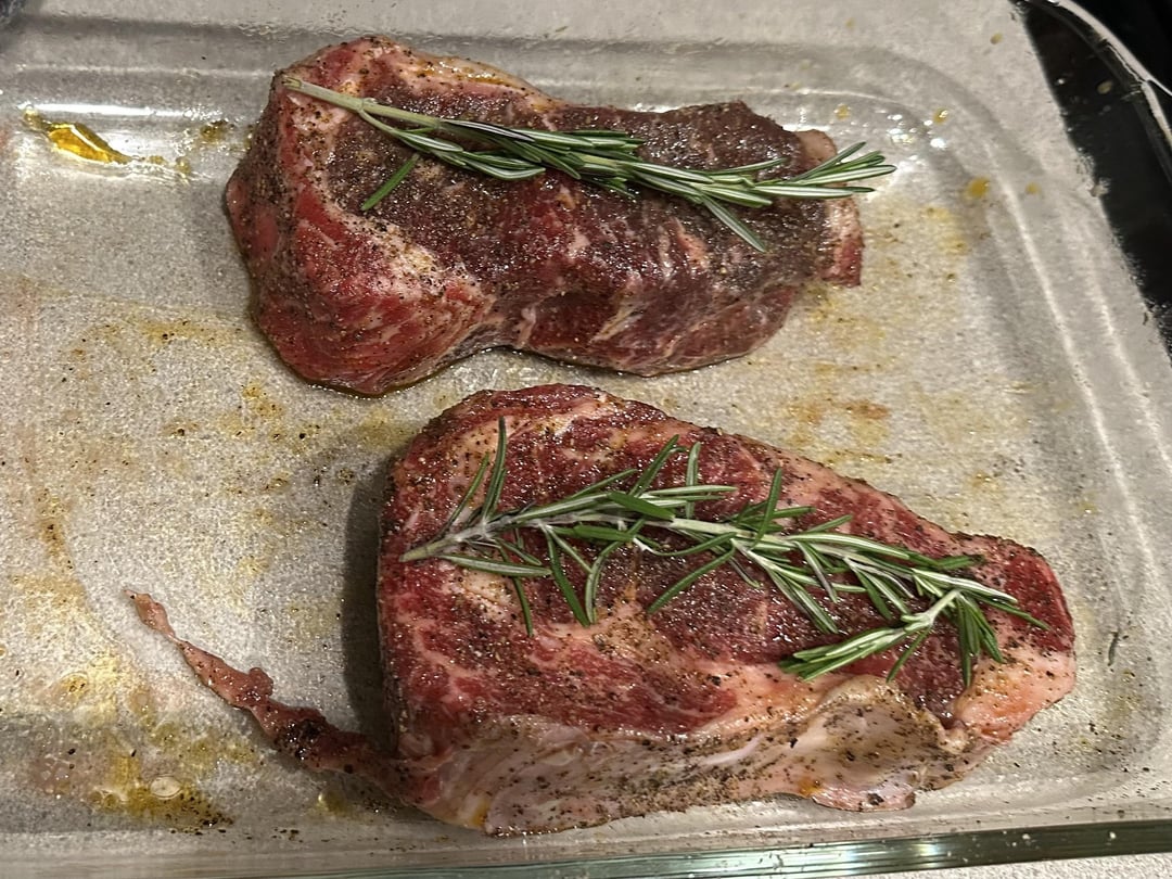 Dry brined, chili oiled, and cracked pepper rubbed. Brushed with rosemary throughout cook. Chargrill seared the smoked with mesquite until about 115ish. Guses were just EVOO and SPG while the steaks rested.