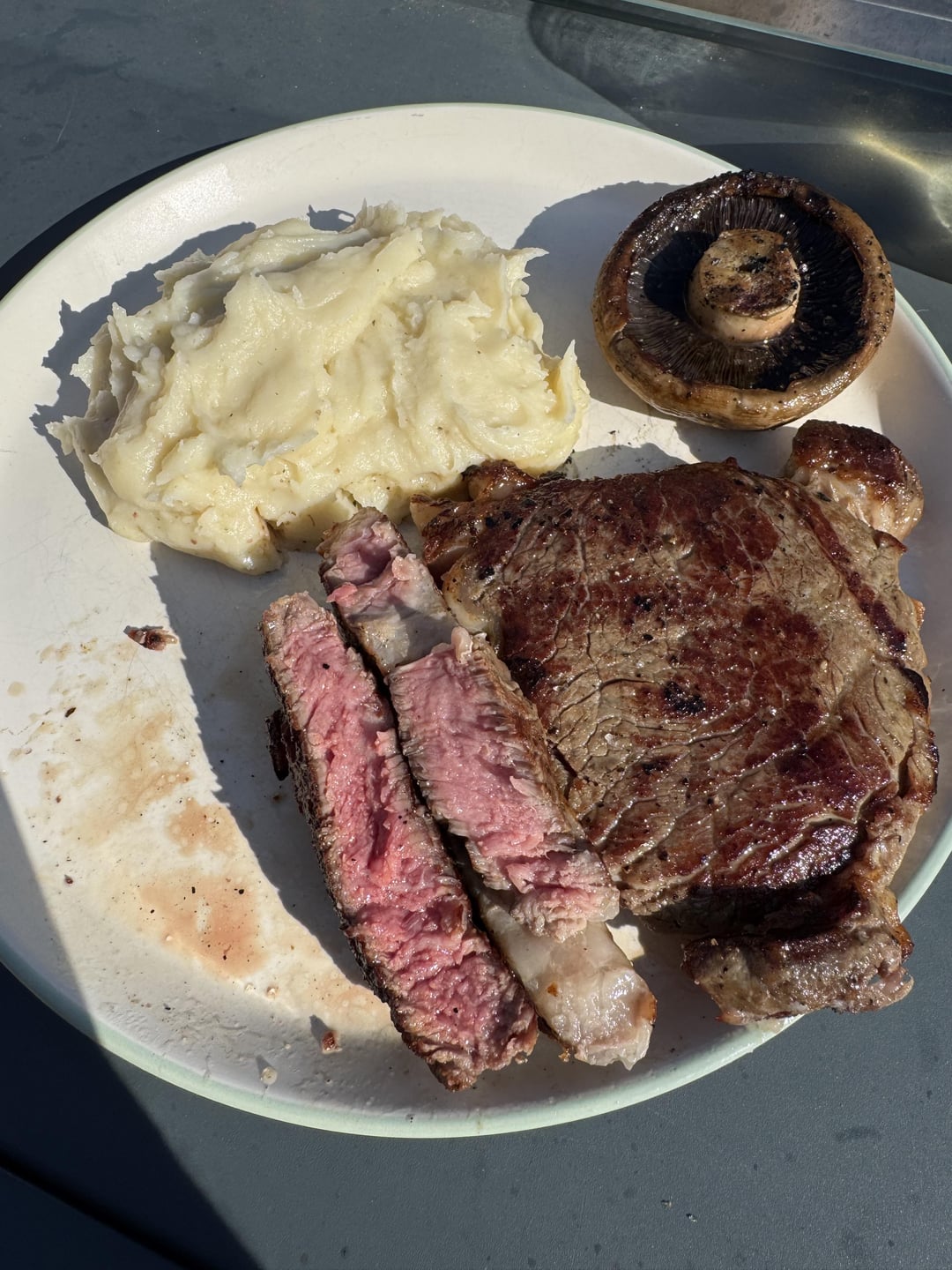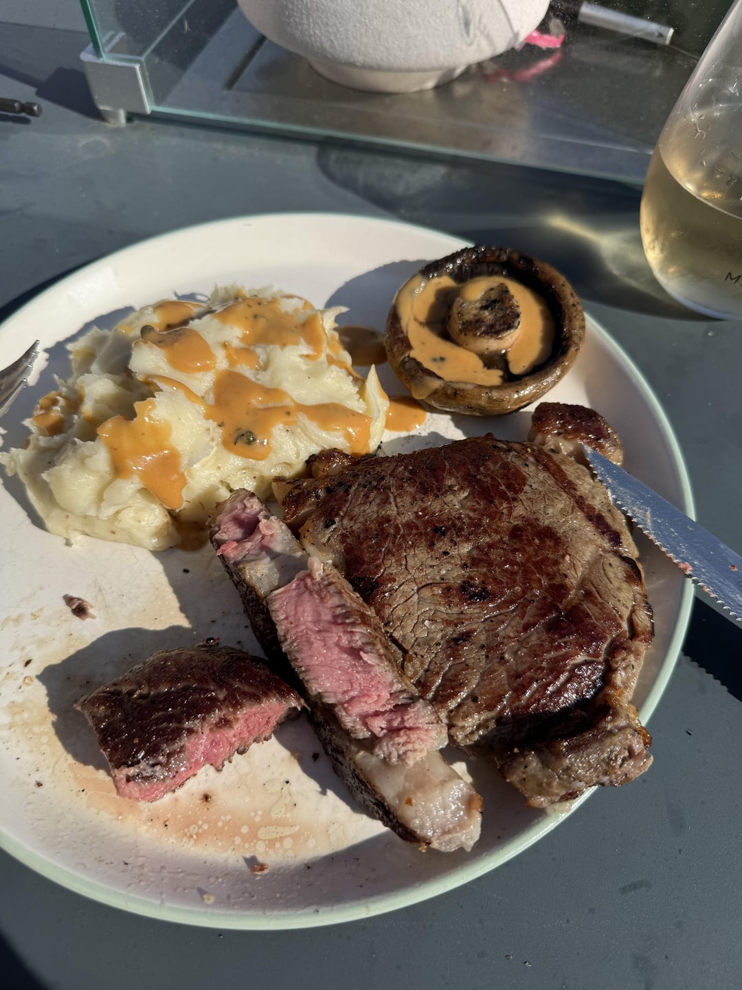 Cheesy mash, flat mushroom and peppercorn sauce to go with it.